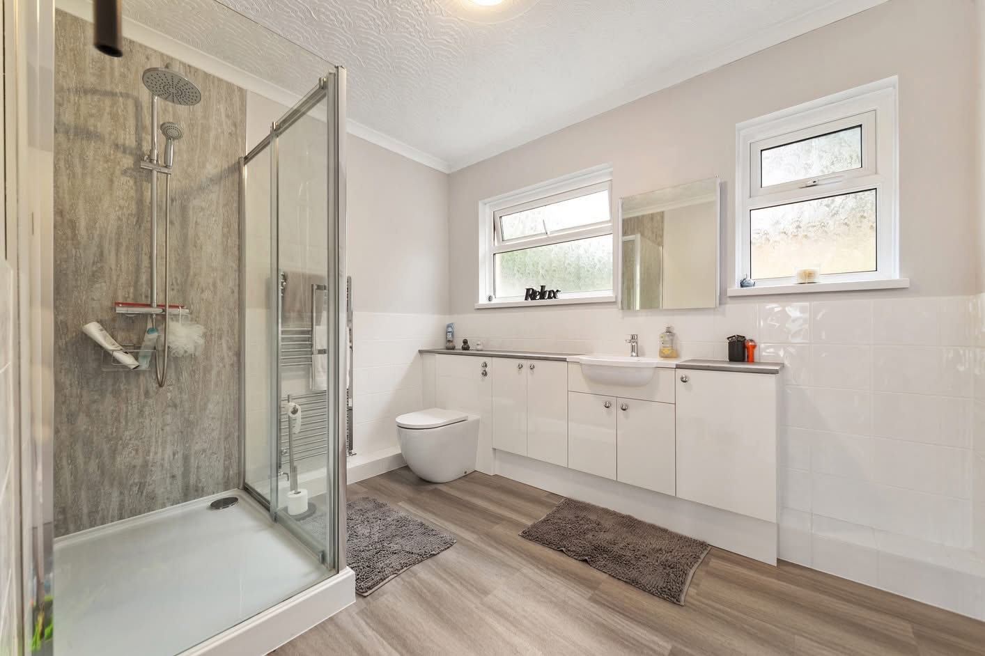 A sleek bathroom with walk-in shower cubicle, housing power shower, part tiling to walls, towel radiator, wash hand basin and low level WC within vanity unit, lovely bright and airy room with two windows to the rear.