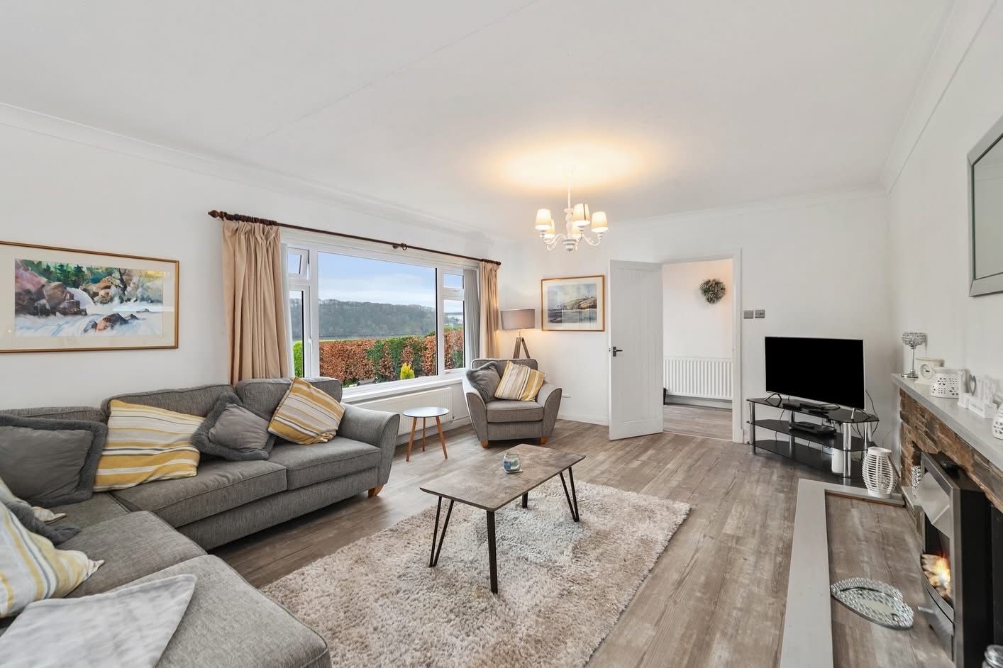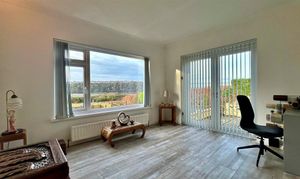 A lovely large and spacious room with magnificent picture windows maximising the enjoyment of the views, feature focal fire with brick surround, radiator, coving to ceiling, ceiling light points, laminate to flooring.