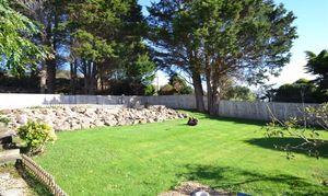 Large fenced garden laid mainly to lawn.