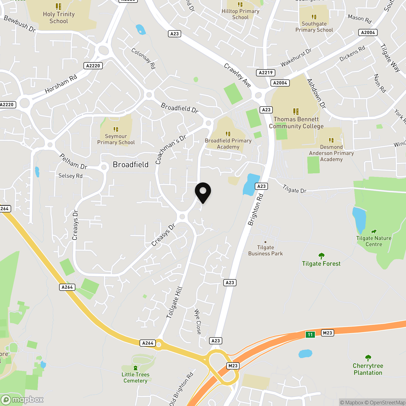 Tollgate Hill is located on the southern side of town, on the outskirts of Broadfield. This is a residential area of property ranging from studio apartments to detached houses and offers easy access to Junction 11 of the M23, the A23 and to the A264 to Horsham. Buchan Country Park and Tilgate Park and Lake are both on the doorstep, great for relaxing strolls on a Sunday afternoon. Bus services from the area are good and Crawley town is readily accessible by car. The nearest railway stations are Crawley, Ifield and Faygate, K2 leisure centre is around the corner off the A23, Horsham town centre is approximately 12 minutes by car and County Mall in Crawley is approximately 10 minutes by car.