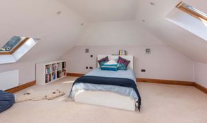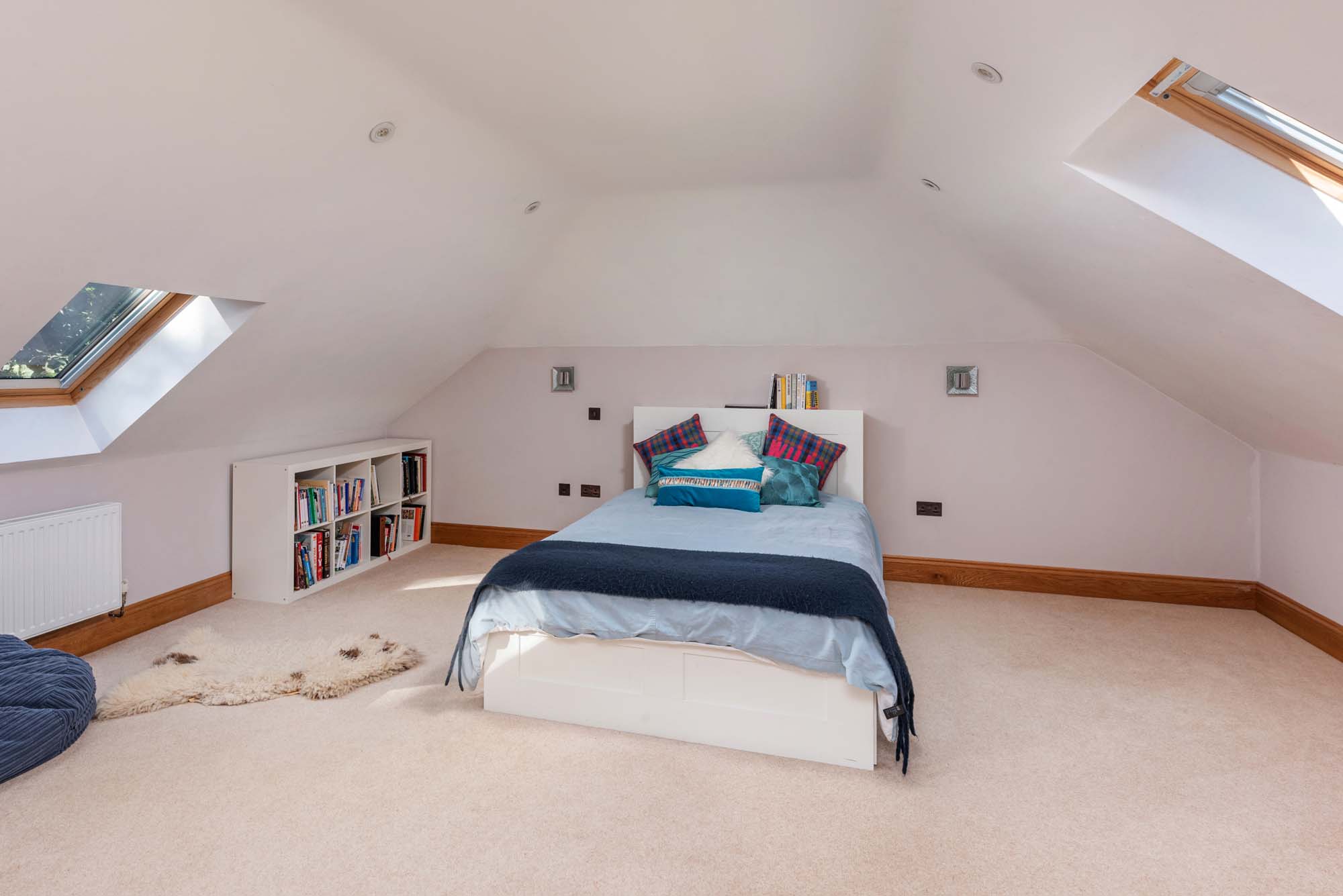 The second floor offers abundant storage spaces, easily accessible from the galleried landing, along with two generously sized and versatile rooms that can be effortlessly adapted to suit your needs, whether as a gym, study, or additional living area. The entire floor is bathed in natural light, thanks to the well-placed Velux windows, creating a bright and inviting atmosphere throughout.