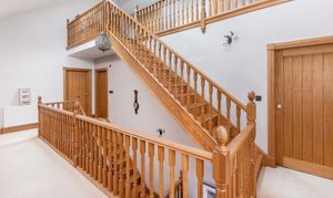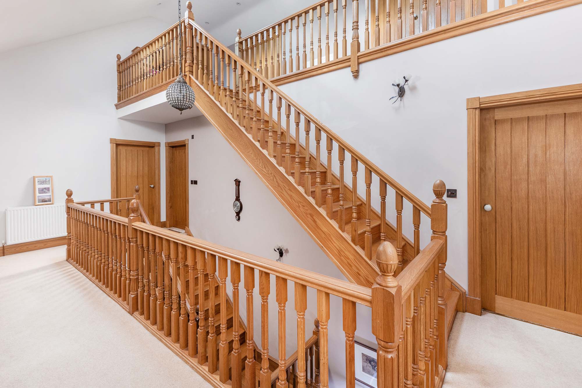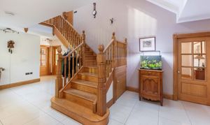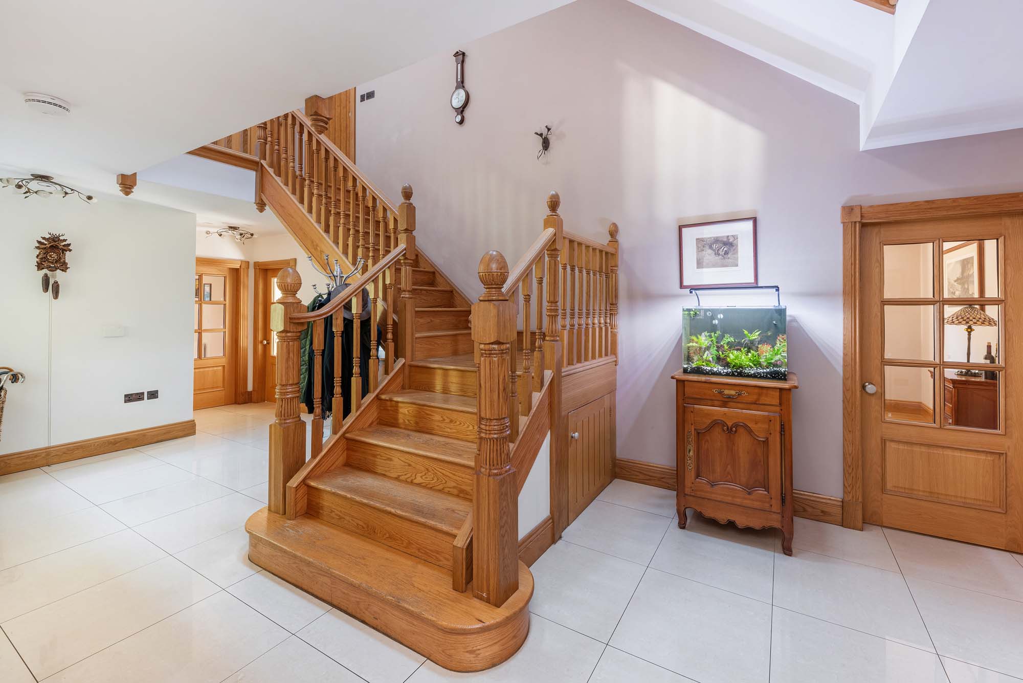 Inside, the main living areas are spacious and beautifully appointed, showcasing a stylish interior with a range of bespoke fixtures and fittings. The triple height entrance hall bathes the area in natural light, setting the tone with an impressive light oak staircase and gleaming porcelain-tiled floor. Oak internal doors lead you around the ground floor living spaces and into the integral double garage and storeroom.