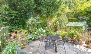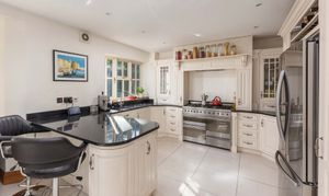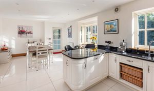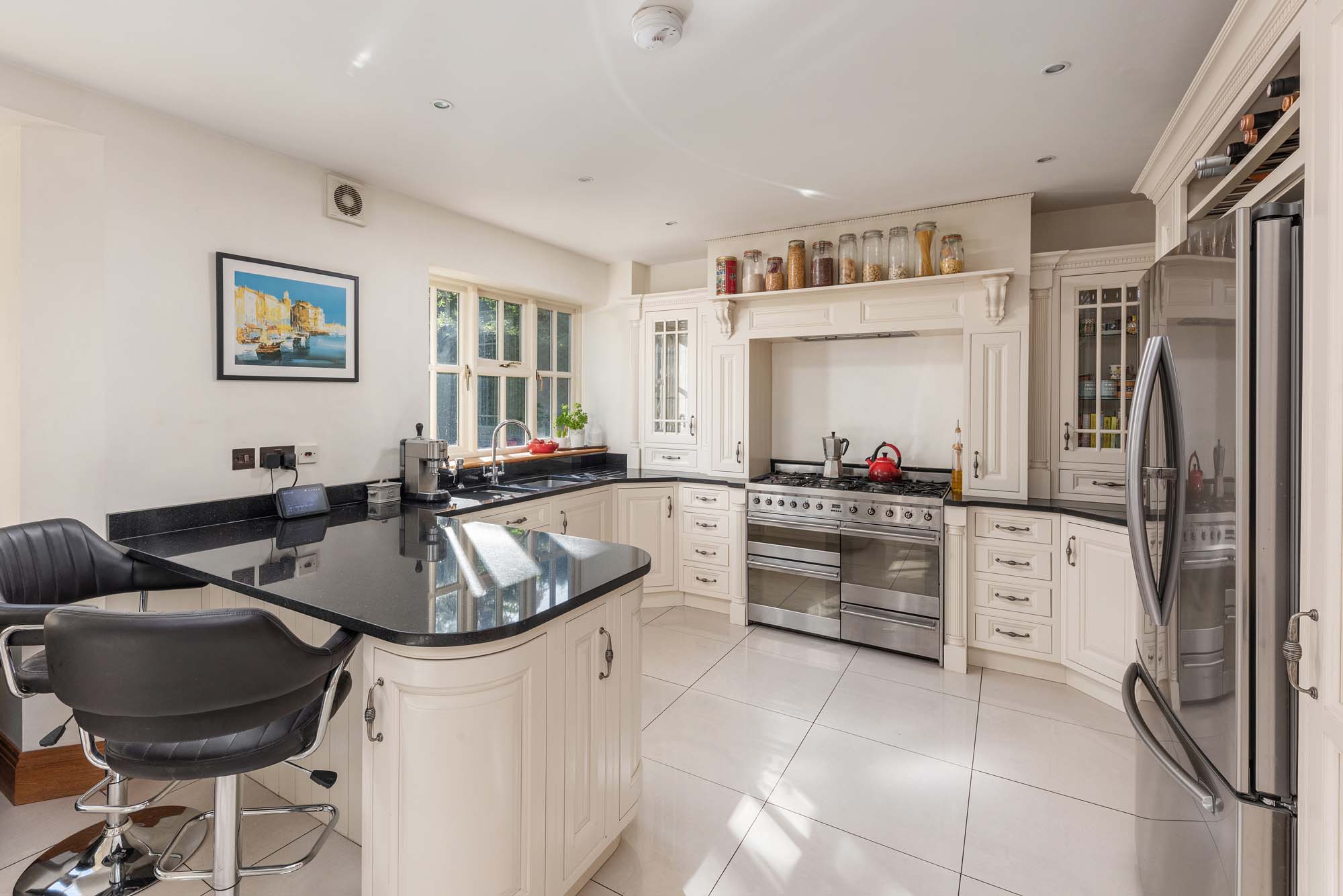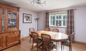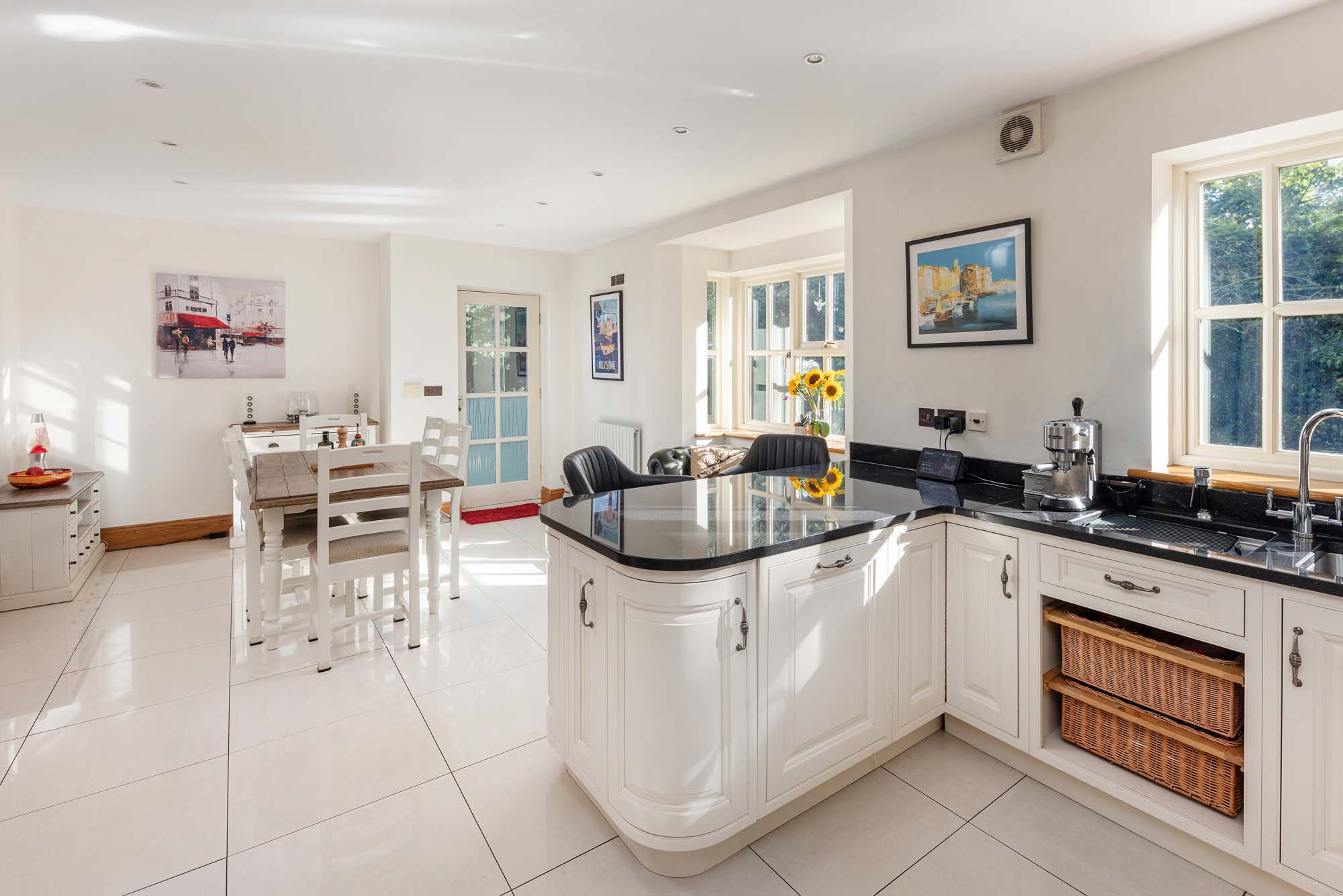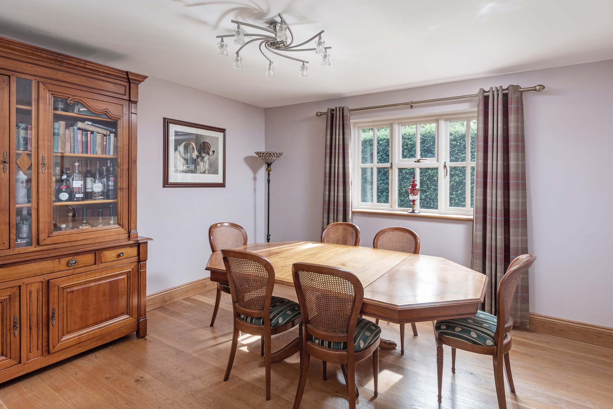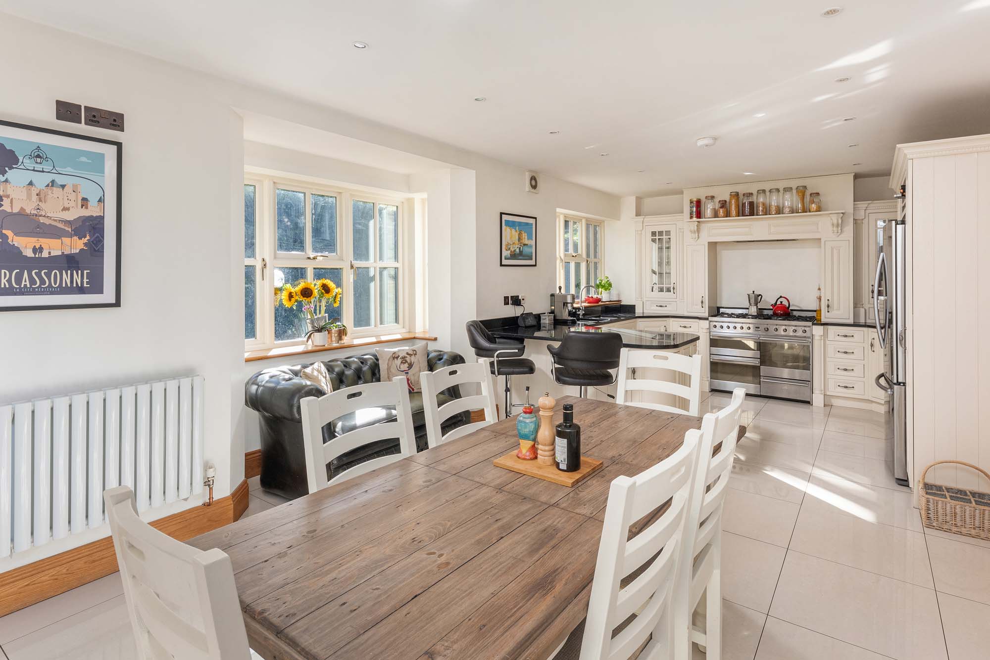 The dining kitchen boasts an extensive range of elegant bespoke Old English White cabinetry, complemented by sleek black granite worktops. With ample room for a dining table and chairs, it offers a perfect setting for casual meals. For more formal gatherings, the separate dining room provides the ideal space, with warm wooden flooring and windows that look out onto the garden.