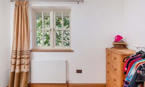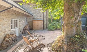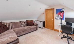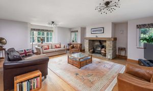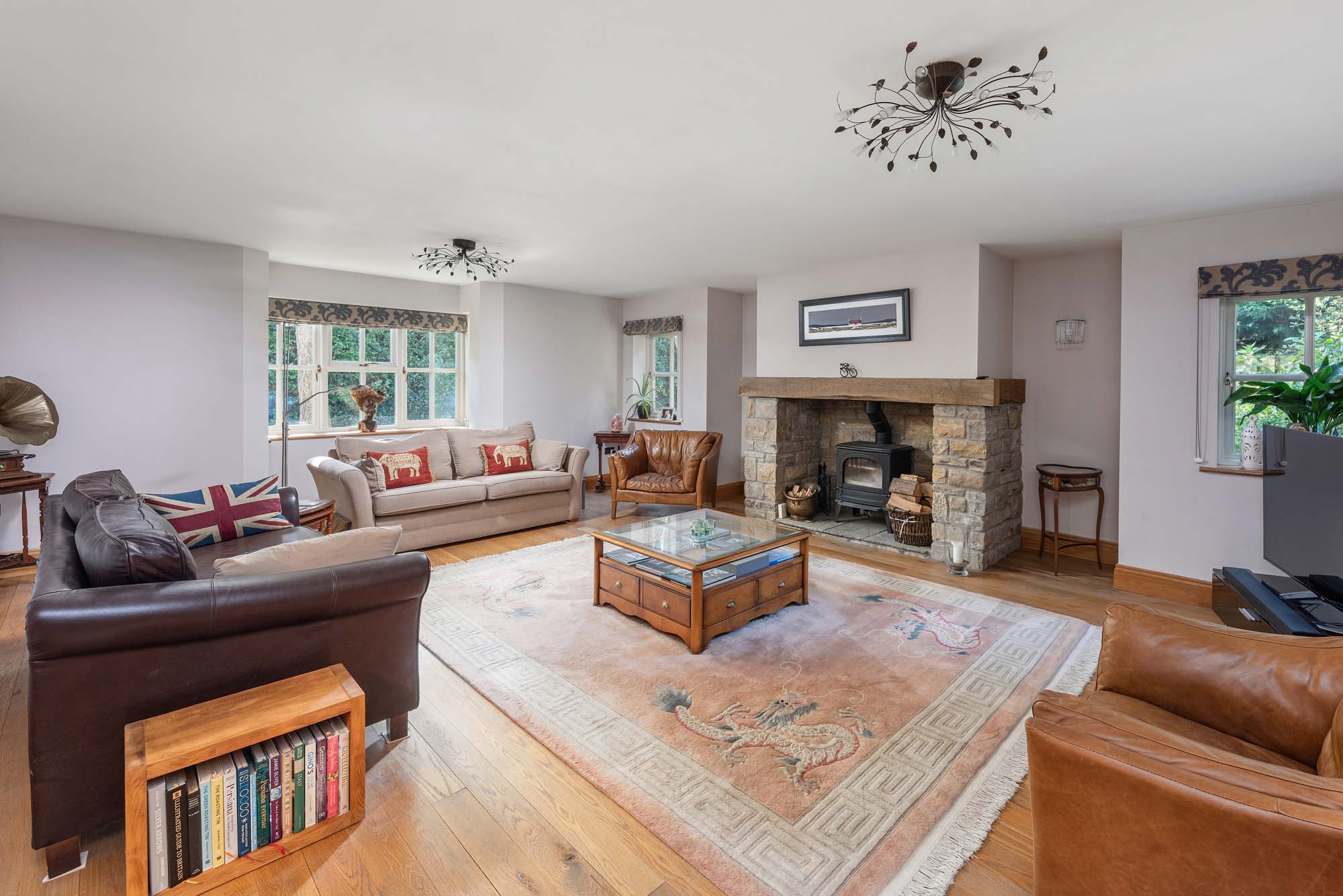 Adjacent to the kitchen is a versatile room. This flexible space is currently set up as an office but is equally suited to serve as a cosy snug or children's playroom. The main living room provides an inviting space for relaxation, tastefully decorated in warm neutral tones. The furniture is thoughtfully arranged around a contemporary wood-burning stove, which is set within a striking inglenook stone fireplace with a solid oak mantle. A convenient downstairs WC and a well-equipped utility room with full plumbing for appliances complete the ground floor.