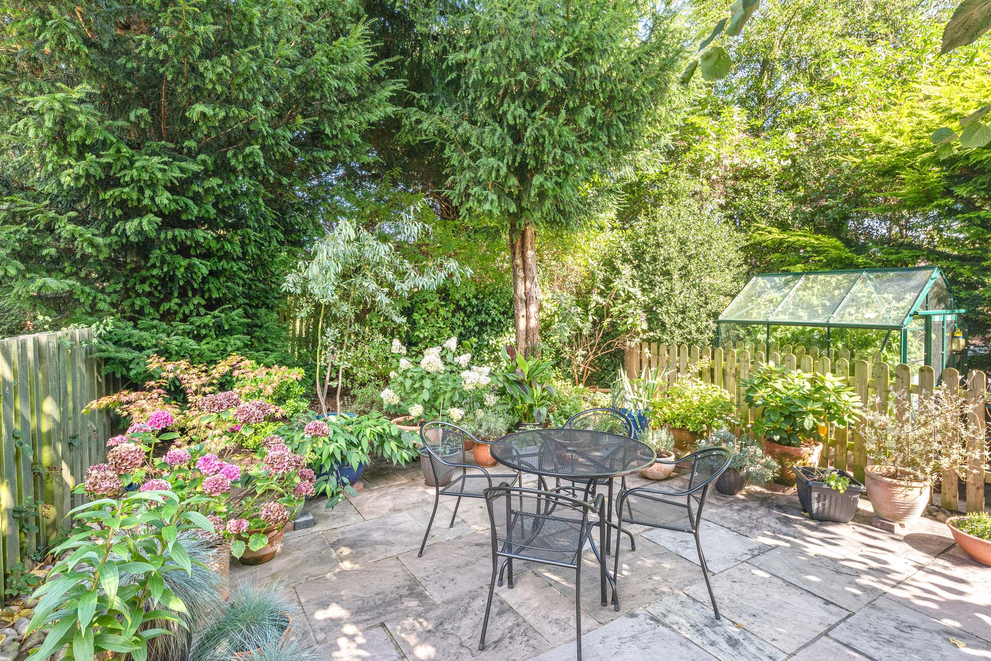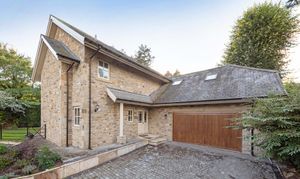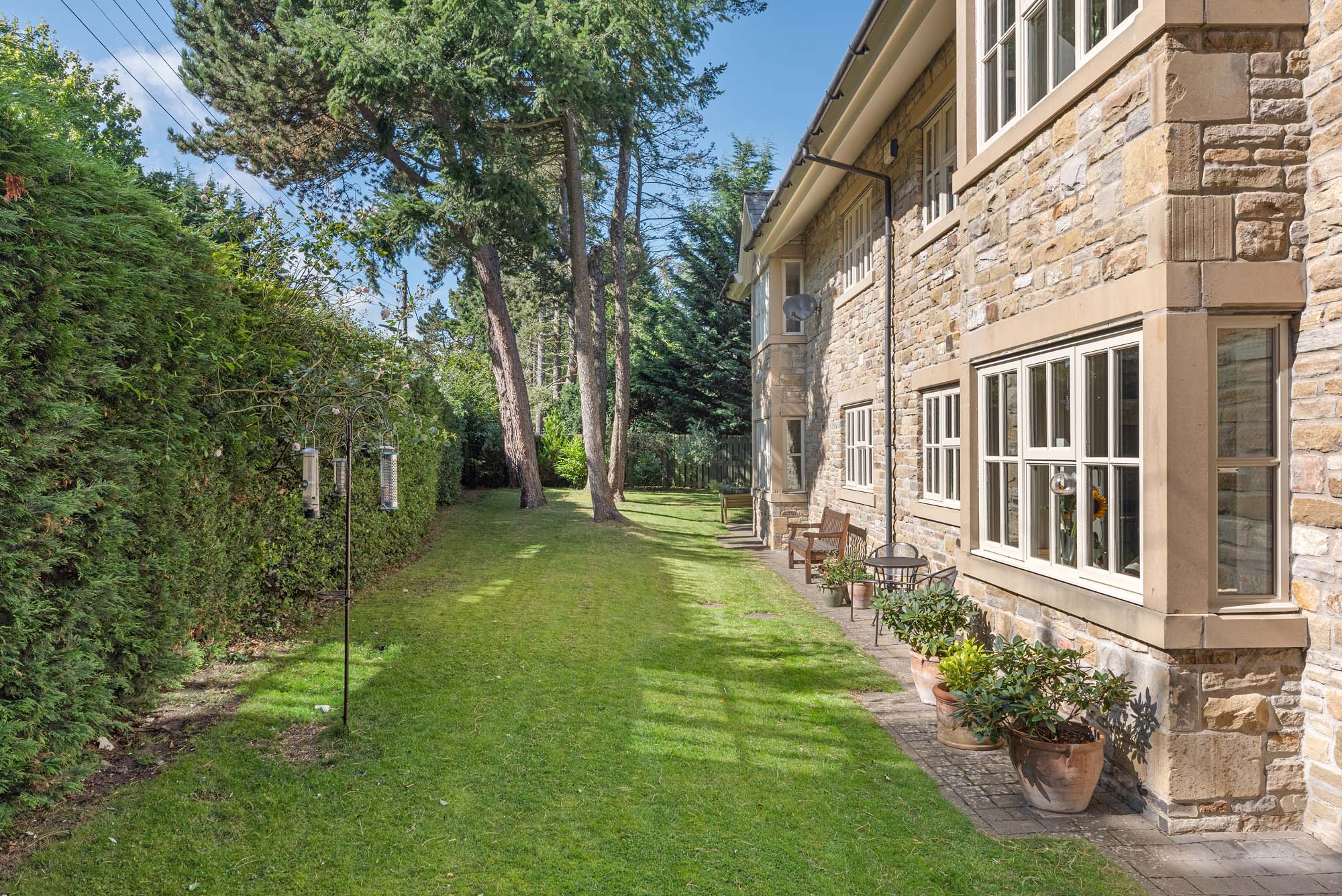 The grounds are surrounded by mature pine trees, offering enhanced privacy and a sense of seclusion which are not overlooked. The gardens, which wrap around the property, are predominantly laid to lawn and benefit from a desirable south-facing aspect, ensuring plenty of sunlight throughout the day. A large stone-paved patio to the side serves as a wonderful space for alfresco dining and entertaining.