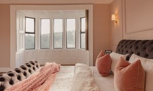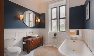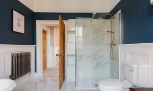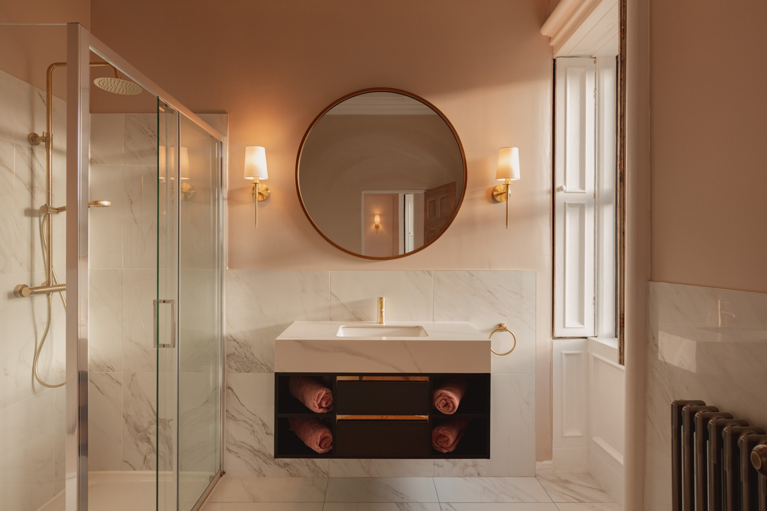 A stately staircase rises to the first floor, where the accommodation is arranged around a broad landing. The main house provides three bedrooms at this level, including a well proportioned principal suite with its own dressing room and en suite shower room. Two further double bedrooms are calm and spacious, each enjoying elevated views across the surrounding landscape. A dedicated laundry room adds everyday practicality, while the family bathroom is particularly noteworthy, finished with a cast iron bath, separate shower, bespoke vanity unit and a television positioned for indulgent, unhurried evenings.