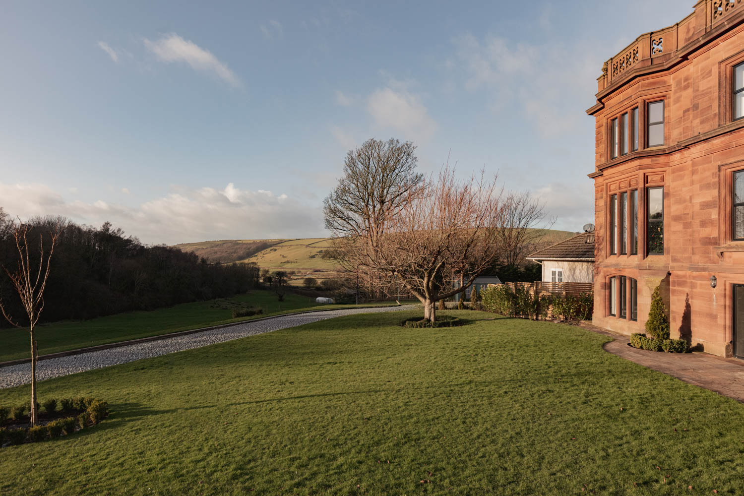 The gardens are arranged across a series of gently stepped levels, predominantly laid to lawn and framed by mature planting beds. A ha ha preserves uninterrupted views across the surrounding countryside, creating a strong sense of openness while maintaining privacy. Paved terraces are positioned for alfresco dining and evening gatherings, supported by extensive outdoor lighting, external power points and water supply. Wildlife is very much part of the setting, with red squirrels regularly seen in the garden and deer grazing in the neighbouring fields.