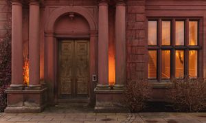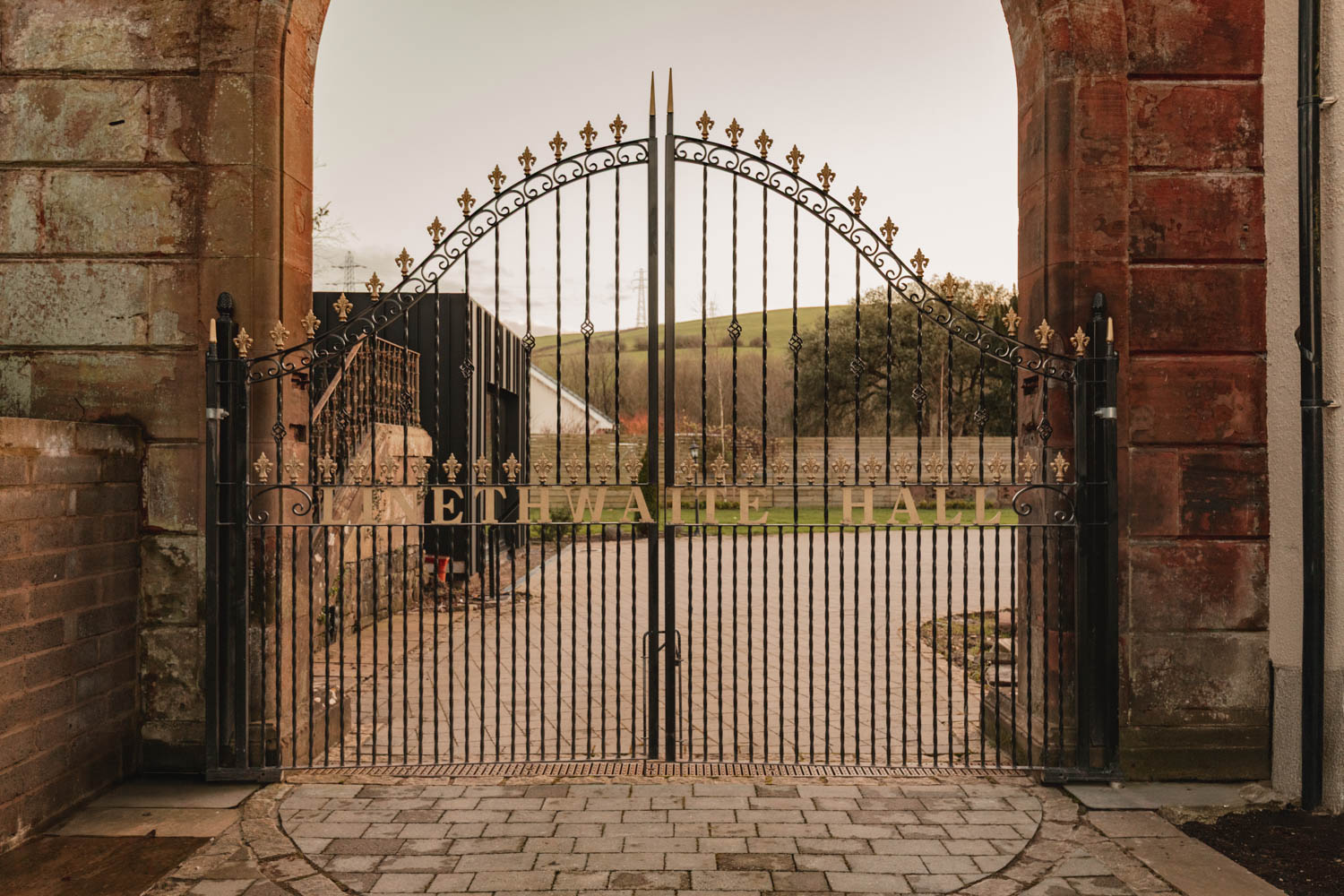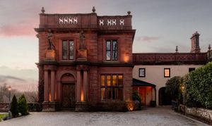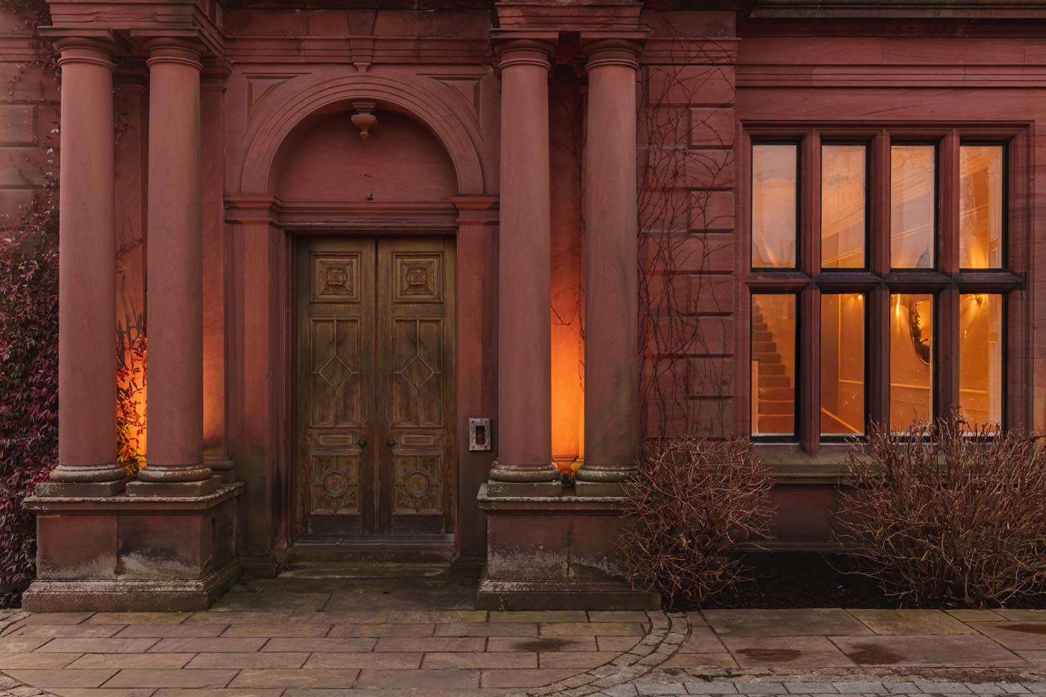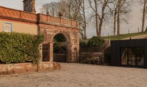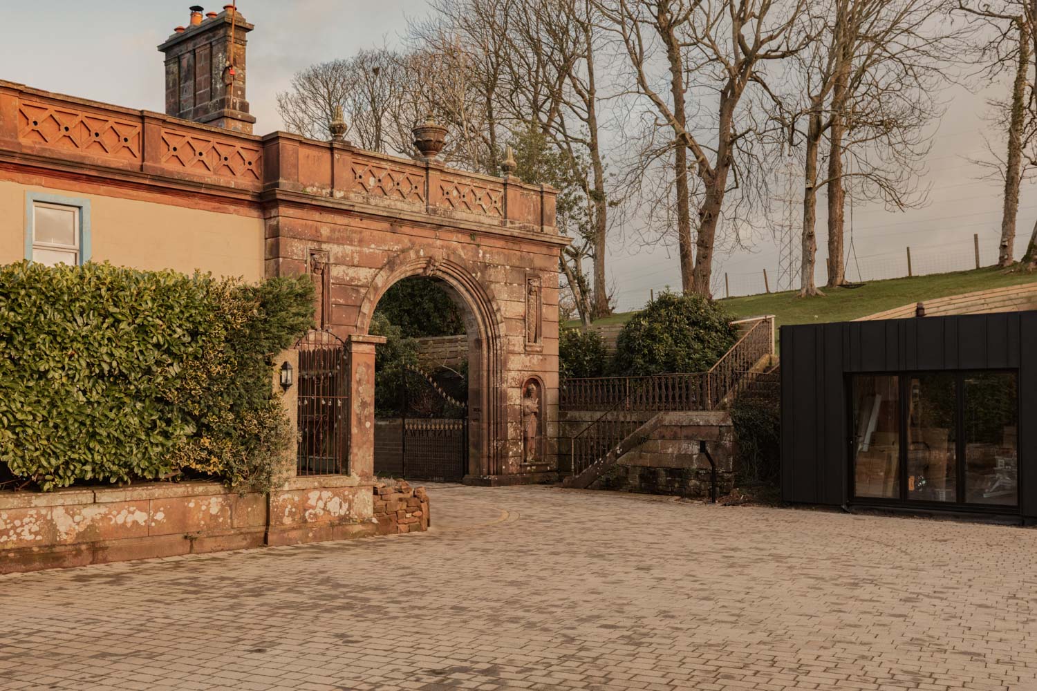 Arrival is a considered experience. Wrought iron gates open beneath a broad sandstone arch, crowned by a carved Poseidon head, leading to a sweeping driveway that curves towards the house. The frontage is striking and unusually individual, softened by lawns and mature planting, while carved sandstone statues believed to depict Queen Victoria, Shakespeare, Joan of Arc and King John lend a distinctive sense of narrative and presence.