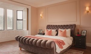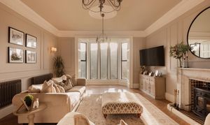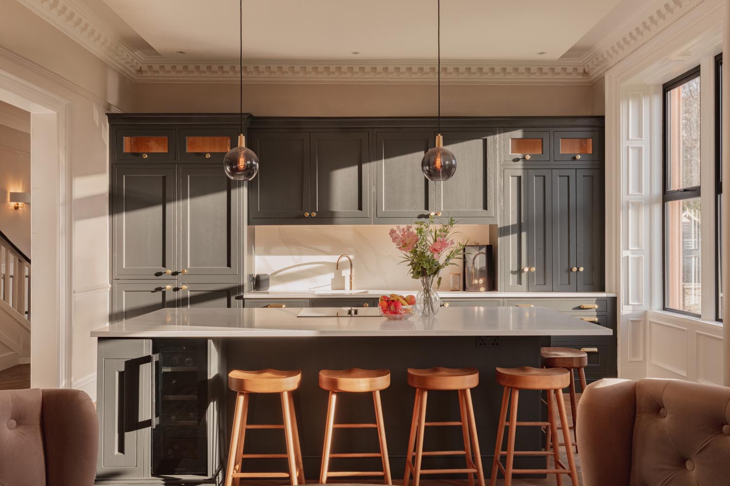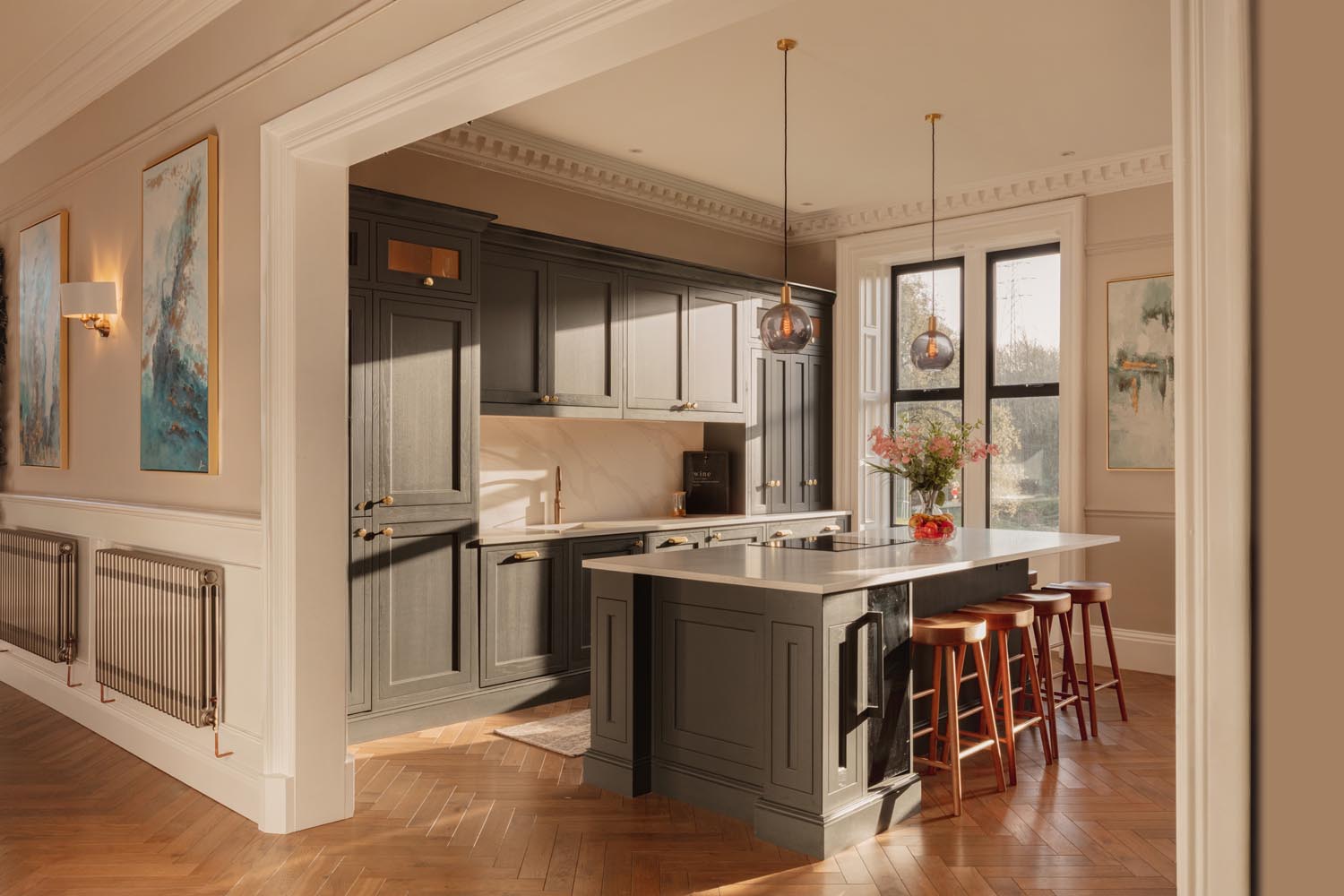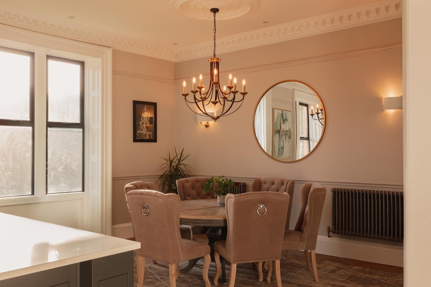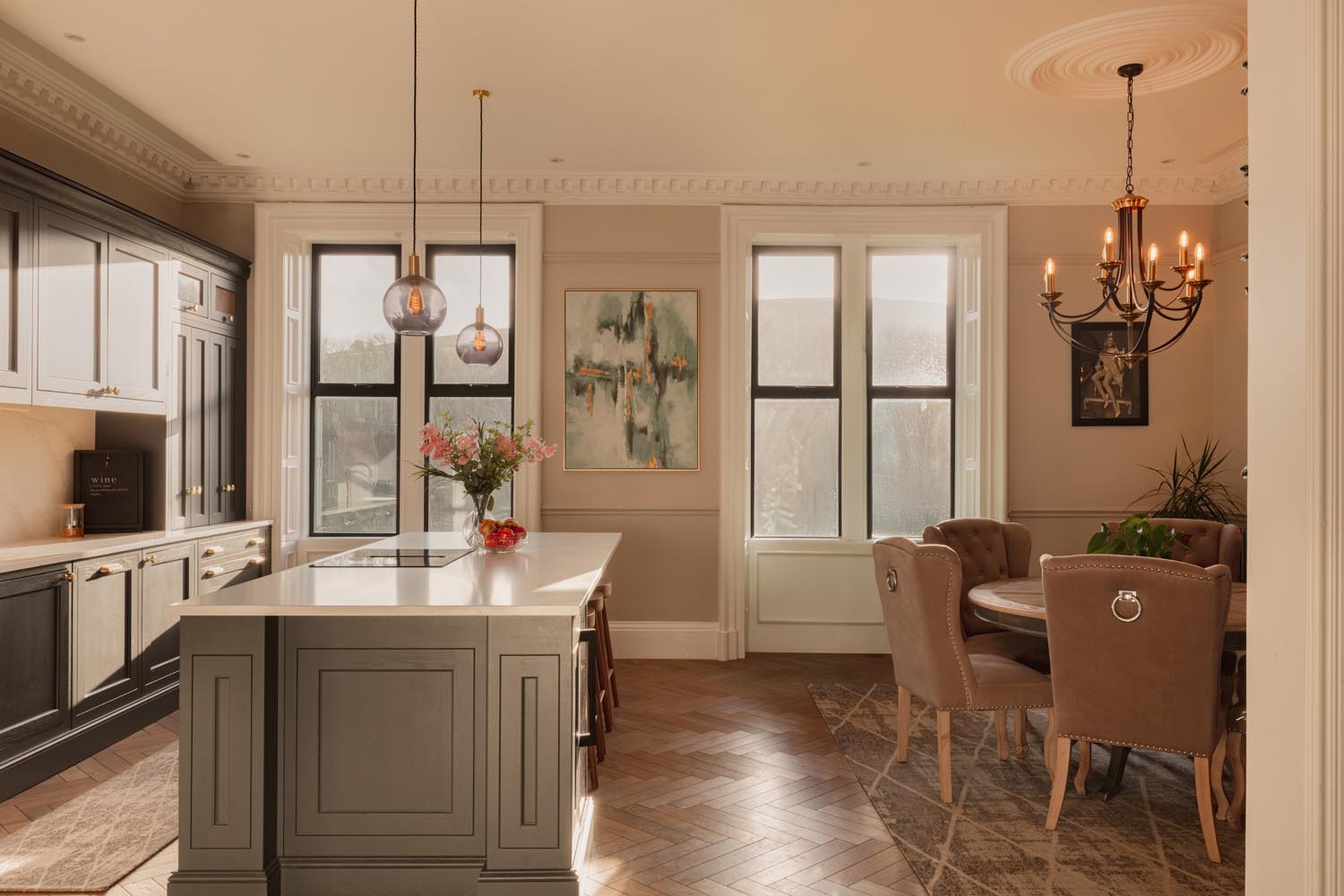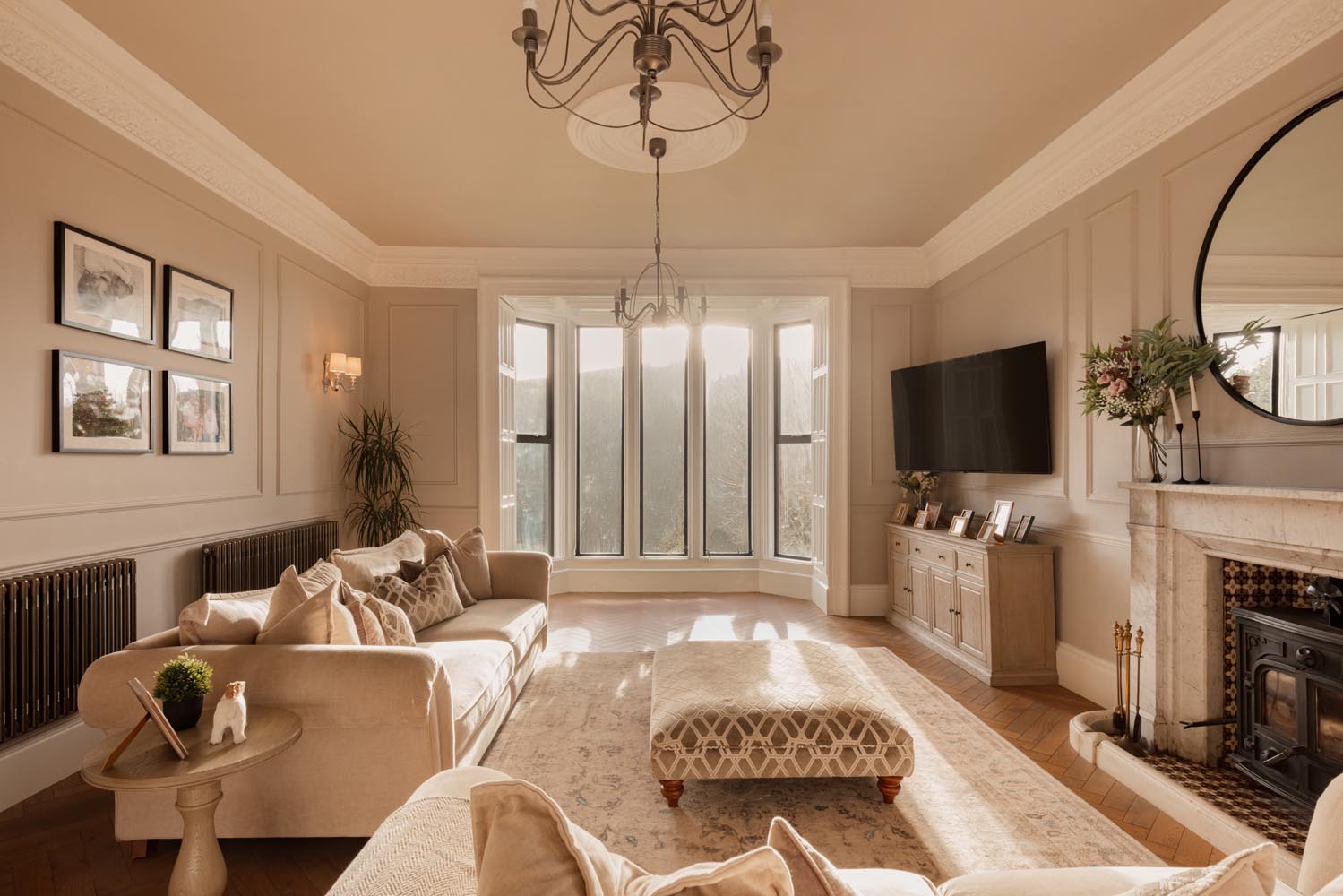 Inside, the house reveals interiors that feel confident and composed, the result of a comprehensive renovation. The scale is immediately apparent, with generous ceiling heights, well judged proportions and a clear sense of flow between spaces. Oak doors run throughout the main house, herringbone engineered oak flooring grounds the principal rooms, and tall sash style windows, many set within deep bays, draw light and landscape into daily life.