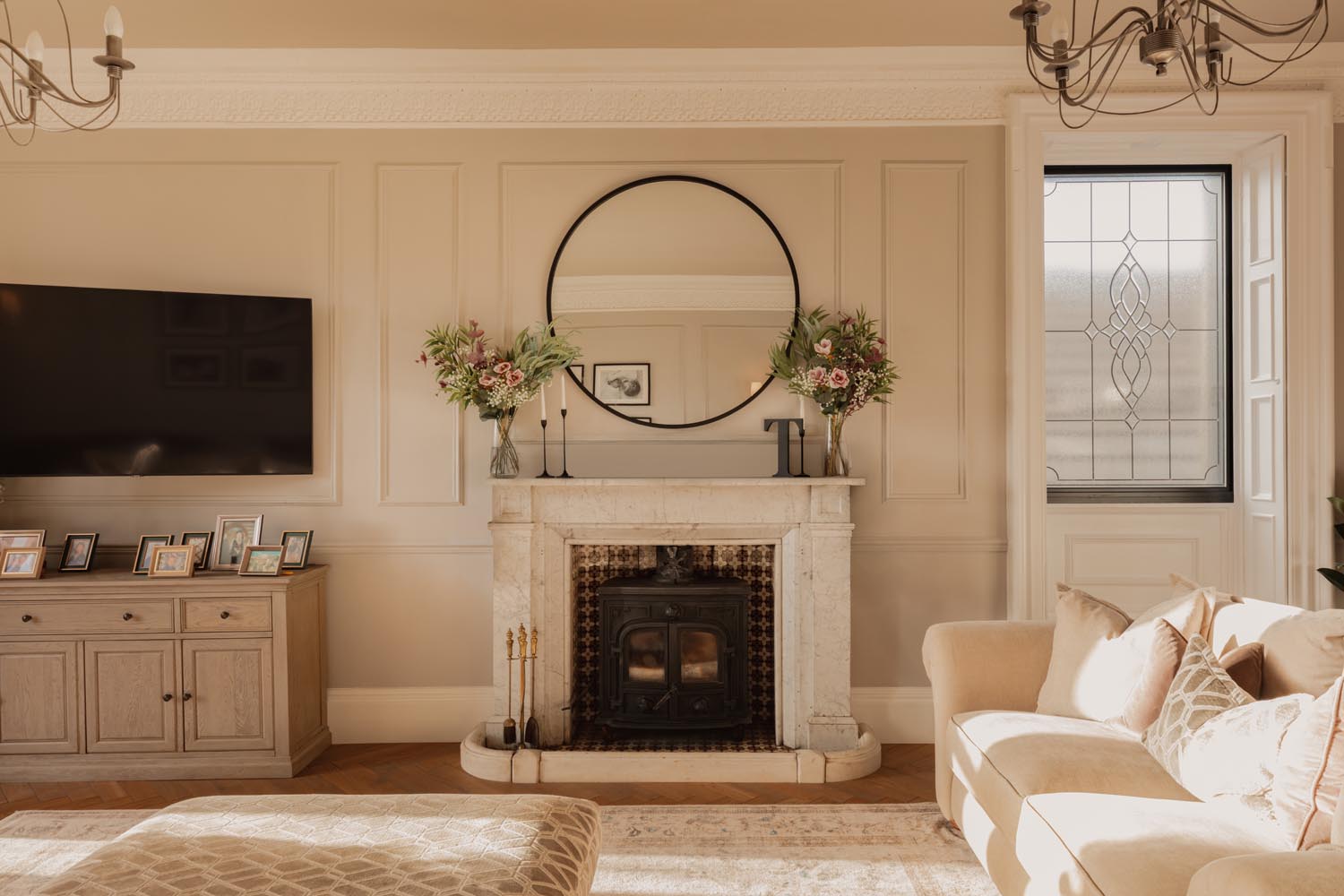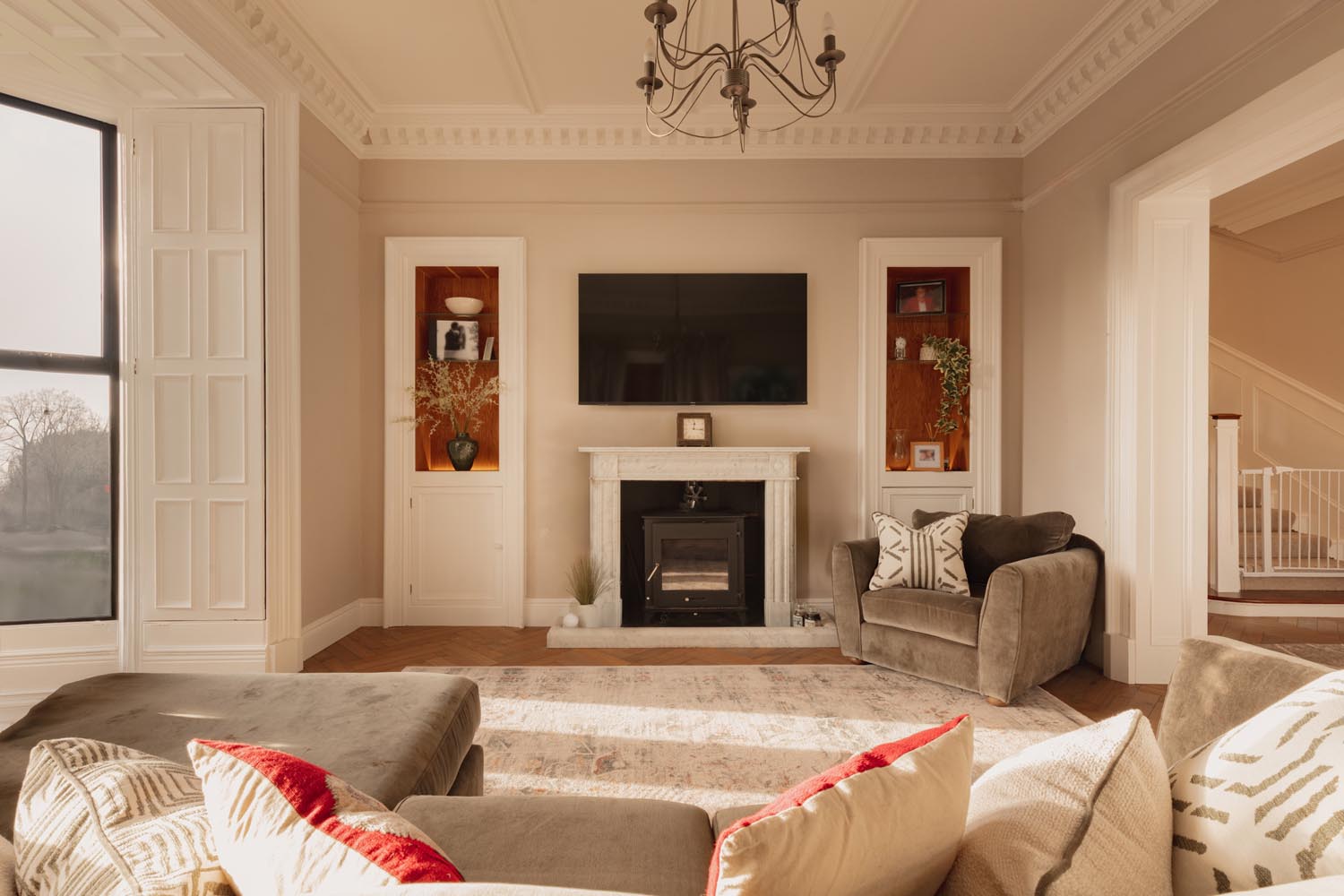 The entrance hall sets the tone, both welcoming and practical, with bespoke storage for coats and shoes and a cloakroom positioned close by. From here, the ground floor opens into a series of reception spaces that unfold naturally. Two principal reception rooms sit to the front of the house, each centred around a log burning stove. One carries a more formal feel, suited to quieter evenings and conversation, while the other is arranged for relaxed everyday use and benefits from its own front door, offering easy access to the gardens.