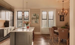 The kitchen is a generous, contemporary space that works effortlessly for both family life and entertaining. Arranged around a substantial central island with seating, it provides ample room for a large dining table without feeling crowded. Siemens ovens and microwave are neatly integrated, alongside a wine fridge, halogen hob with extractor and a boiling water tap. Large black framed aluminium windows bring in excellent natural light and offer a strong visual connection to the gardens and wider countryside, reinforcing the sense of openness that runs through the house.
