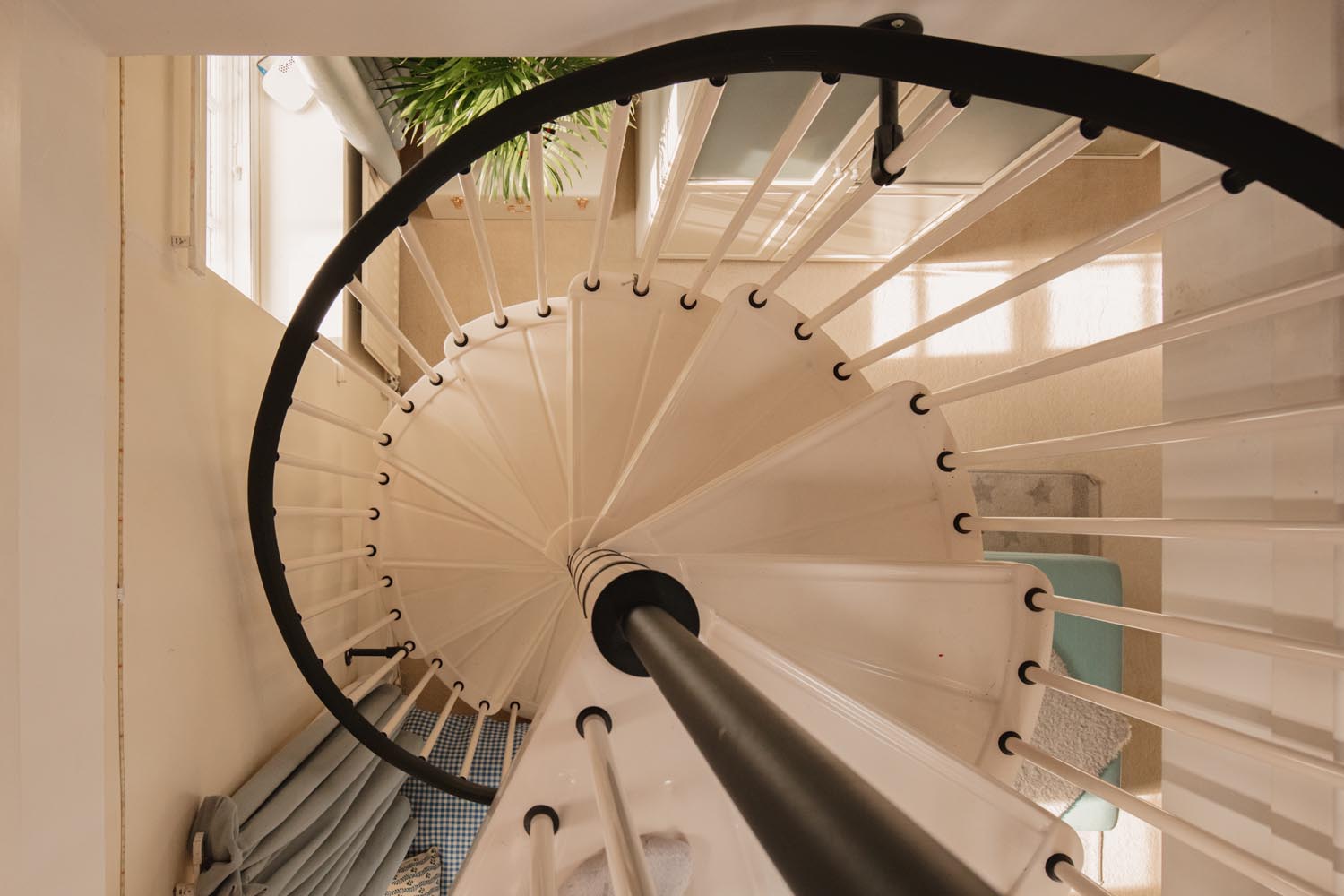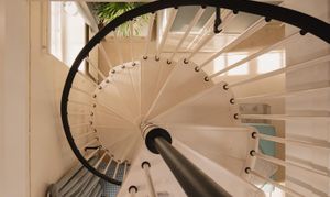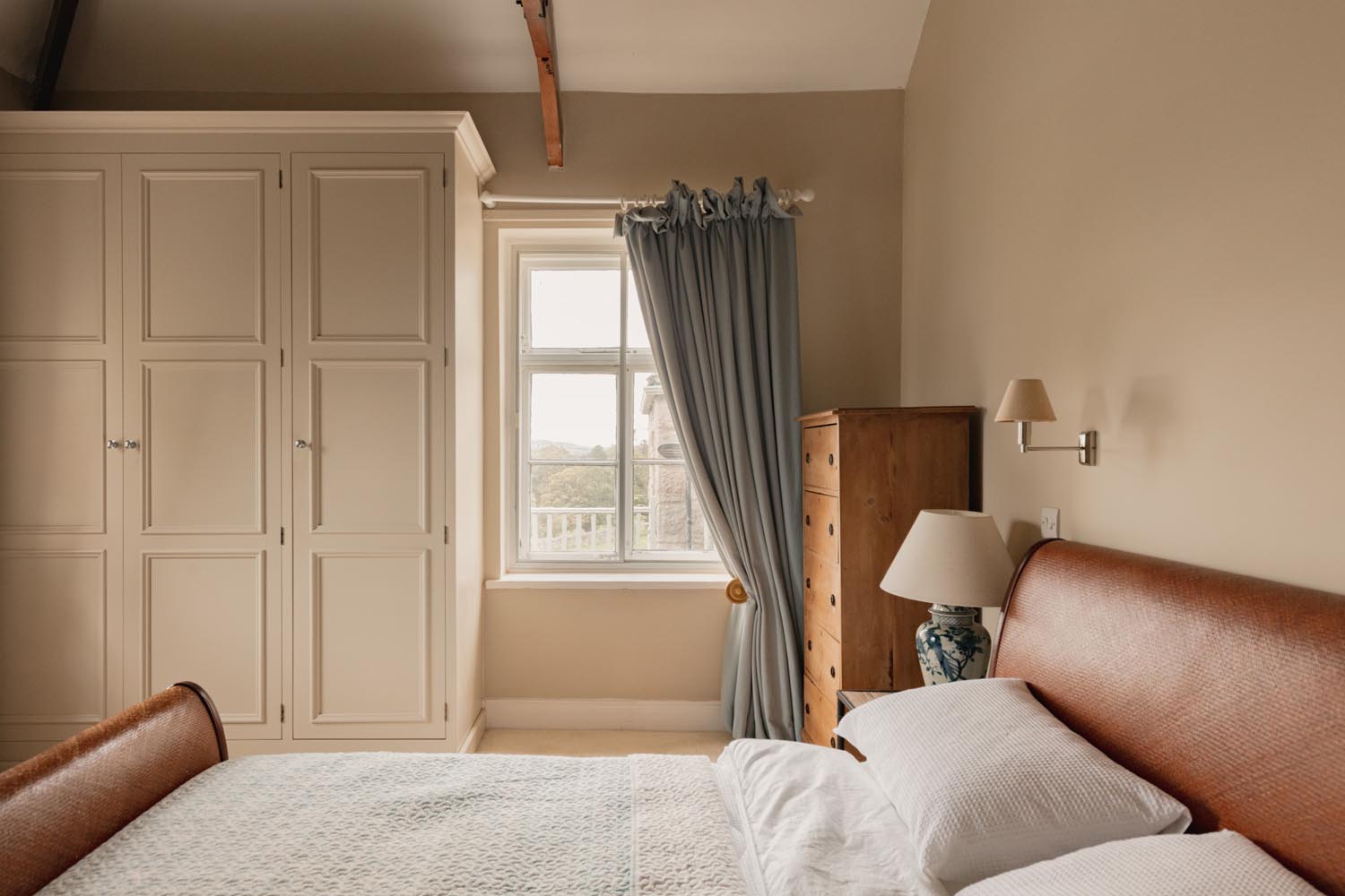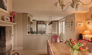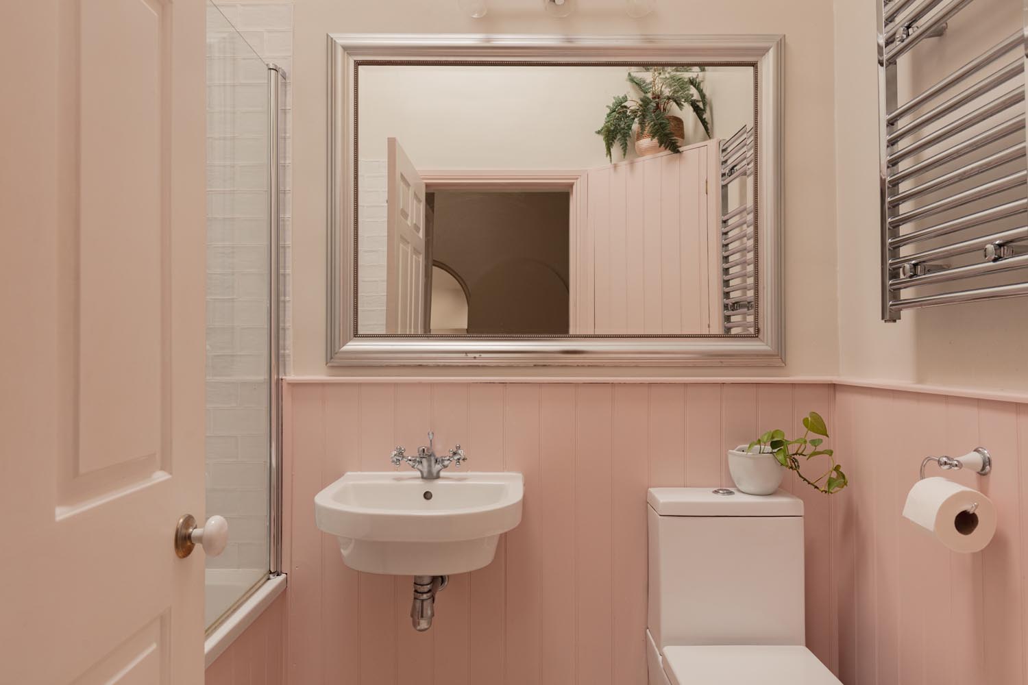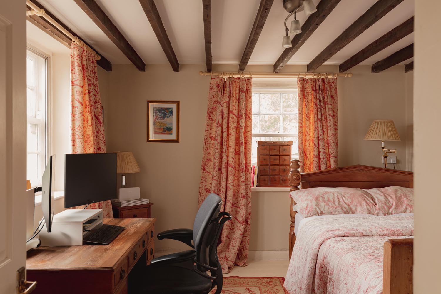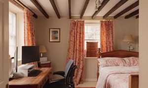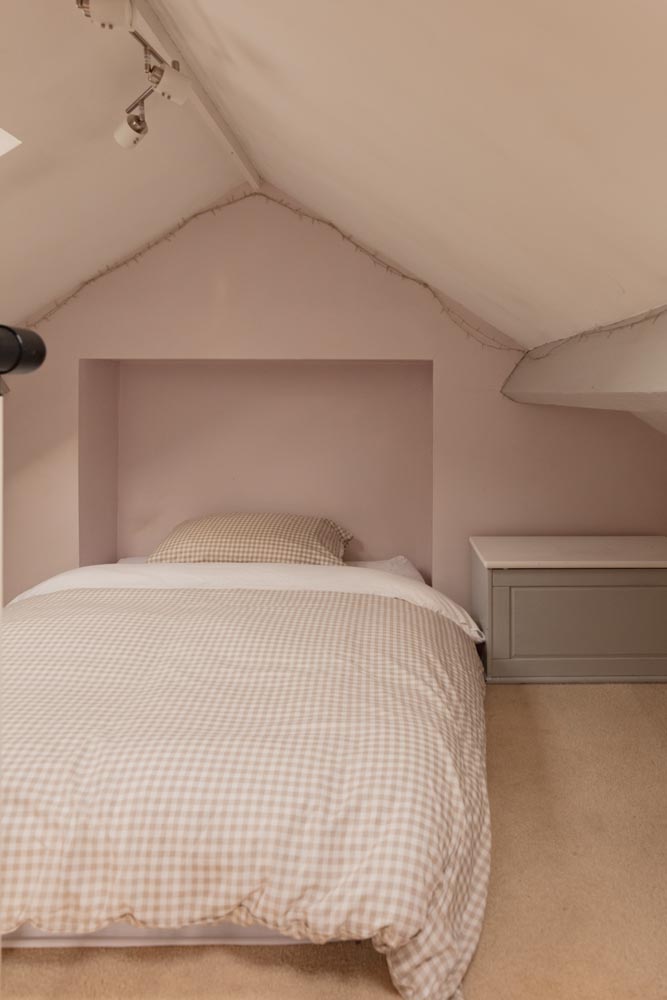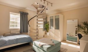 Three double bedrooms sit on this level, including a garden facing principal with en suite, while another bedroom has a spiral stair to a converted attic room, ideal as a private study or occasional sleeping area. The family bathroom is presented in a soft, neutral palette with classic fittings and a quietly modern feel.