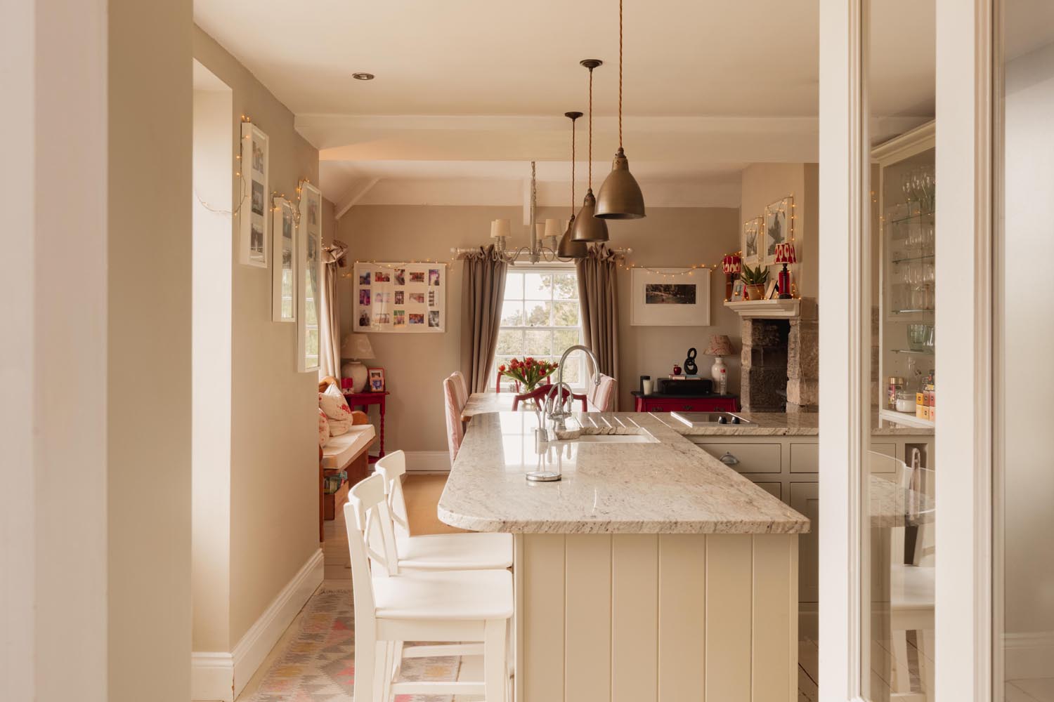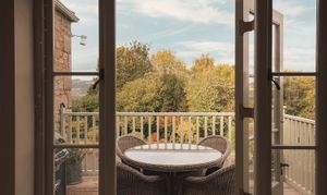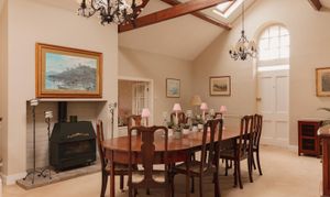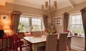 The main living spaces are on the first floor. A broad landing leads to an elegant dining room and an adjoining sitting room with a bay window, stone fireplace and fitted bookcases. The dining room also has a fireplace and multi-fuel stove, and benefits from a secondary entrance at road level. The kitchen and breakfast room forms the heart of the home, with a four-oven electric Aga, integrated appliances, bespoke painted cabinetry and stone worktops. Double doors open to a balcony, well sized for alfresco dining, with long views over the valley.