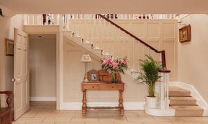 The entrance hall on the ground floor provides a bright and characterful welcome, featuring an exposed stone wall, painted panelling and an open staircase rising to the main living level. This lower floor includes a practical WC, a generous utility room, store room and a versatile double bedroom with exposed ceiling beams, ideal for guests, multi-generational living or could easily serve as an office for home working.