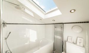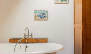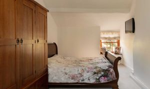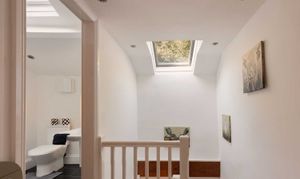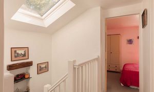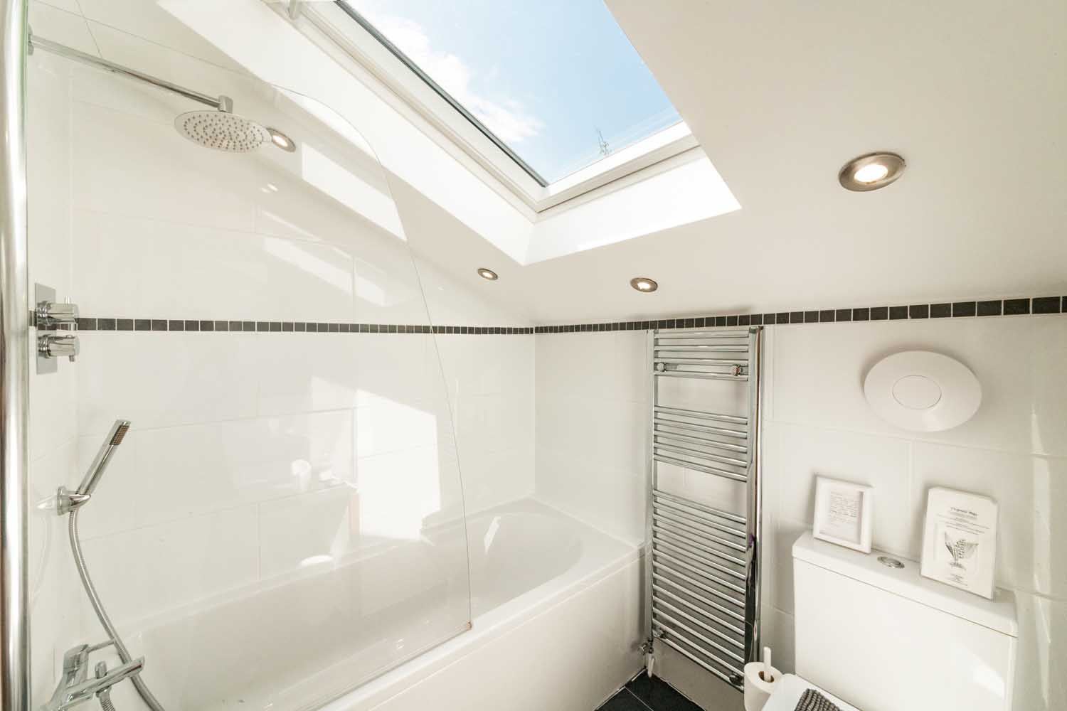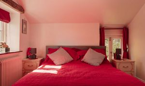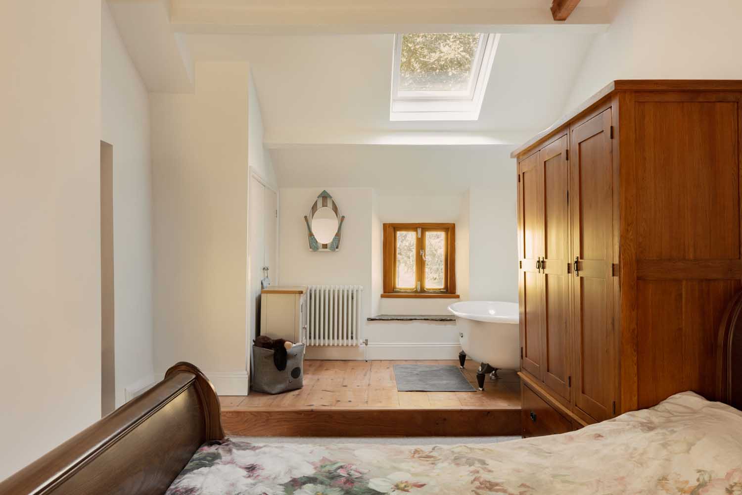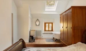Upstairs, the principal bedroom carries real character and volume, a vaulted ceiling with exposed trusses and an elevated area with a freestanding roll top bath beneath a rooflight. A second double bedroom sits across the landing. The shower room is smart and light, with a walk in enclosure, heated towel rail and contemporary tiling.