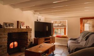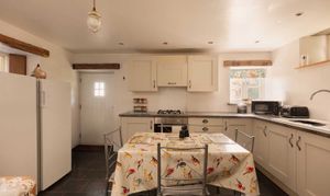 Swallow Barn stands a short stroll away, convenient yet discreet. The ground floor is open plan, slate flooring running throughout and seating organised around a modern wood burner. The L shaped kitchen provides generous preparation space and storage, with an adjacent dining area. On the first floor, two comfortable bedrooms sit either side of a central bathroom with a skylight above the bath and over bath shower, arranged for privacy and easy hosting.