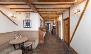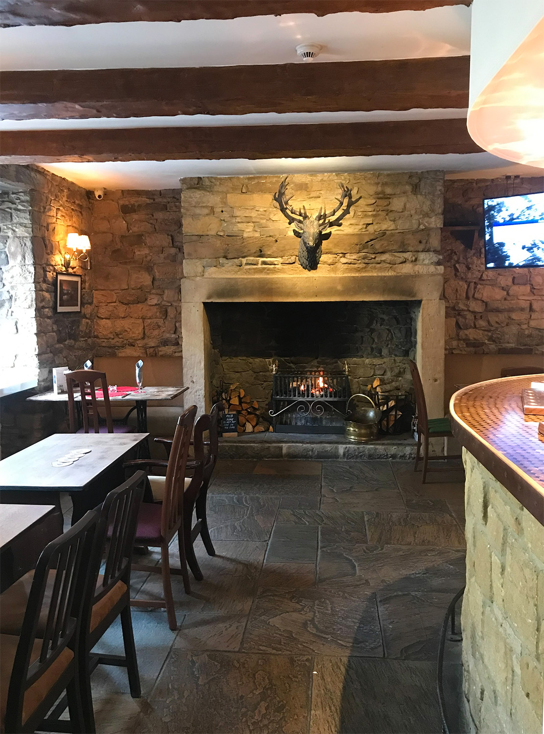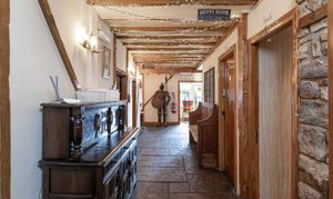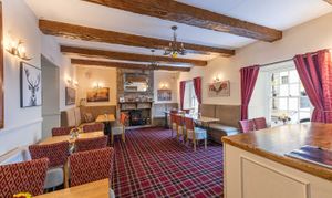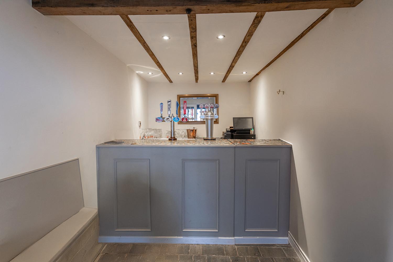 Internally, the inn reveals a sequence of welcoming spaces that accommodate the needs of a modern operation. The entrance hall, with its flagged floors, exposed timbers and traditional detailing, leads through to the dining room, a generous setting for hosting, anchored by a stone fireplace and exposed beams. The adjoining bar and lounge area offers an inviting, informal atmosphere, while a function room beyond provides further capacity for events and gatherings. The commercial kitchen, utility spaces and extensive stores are all well-appointed to support the smooth running of the business.