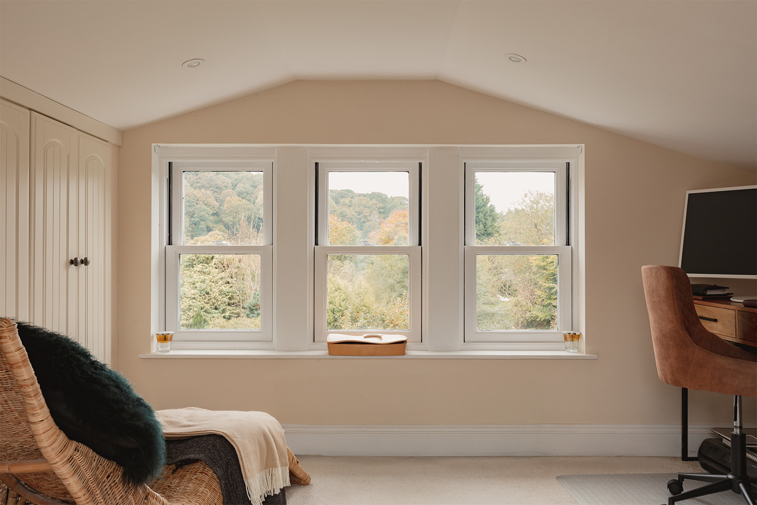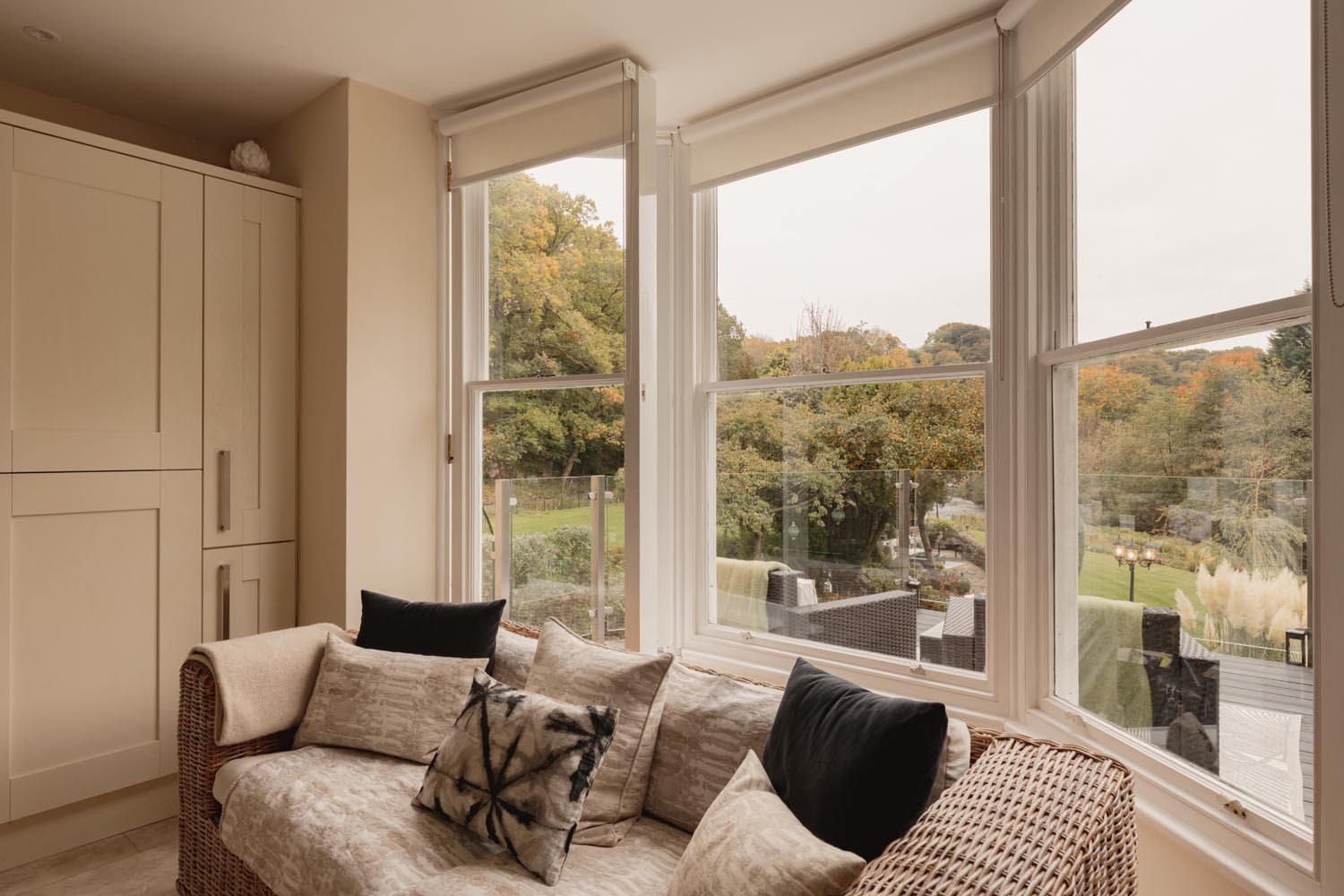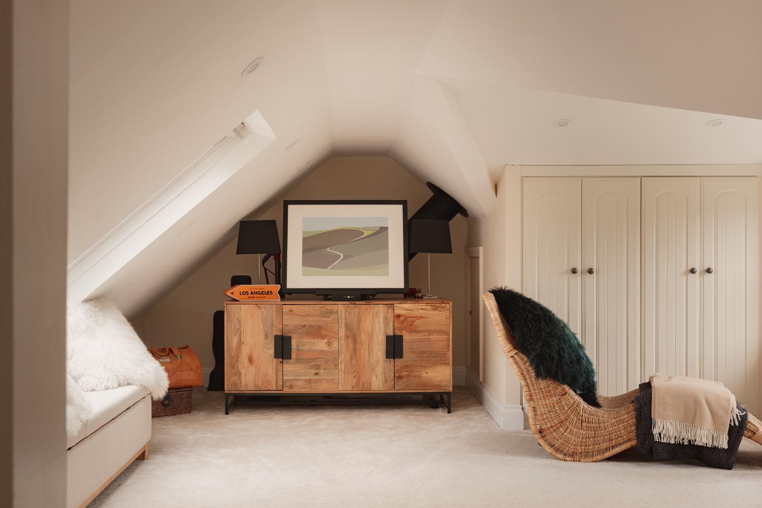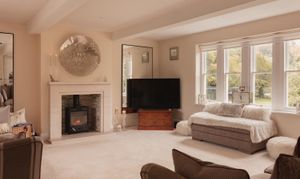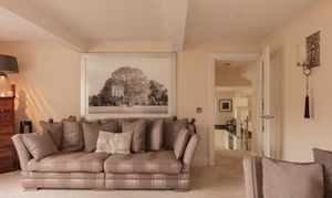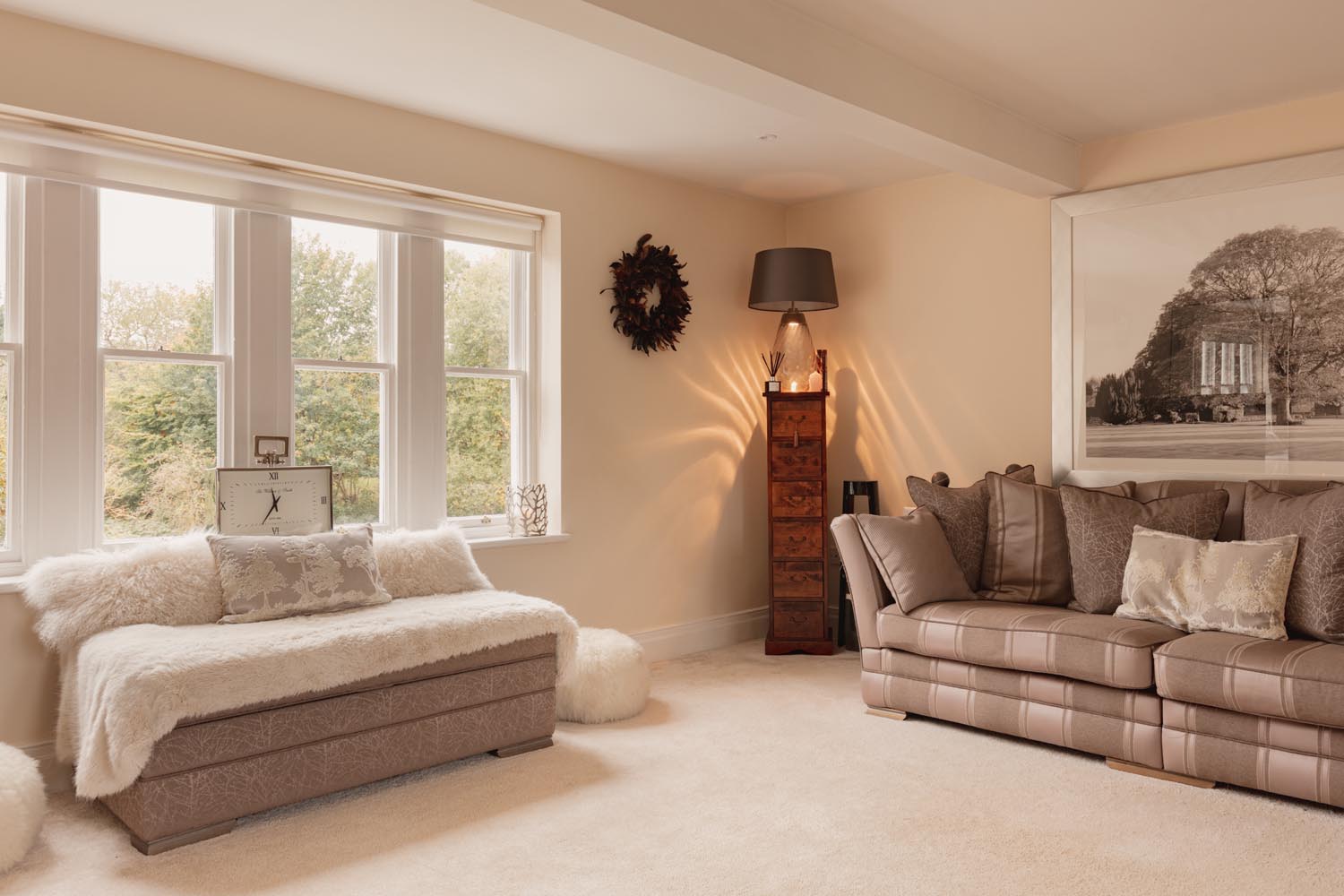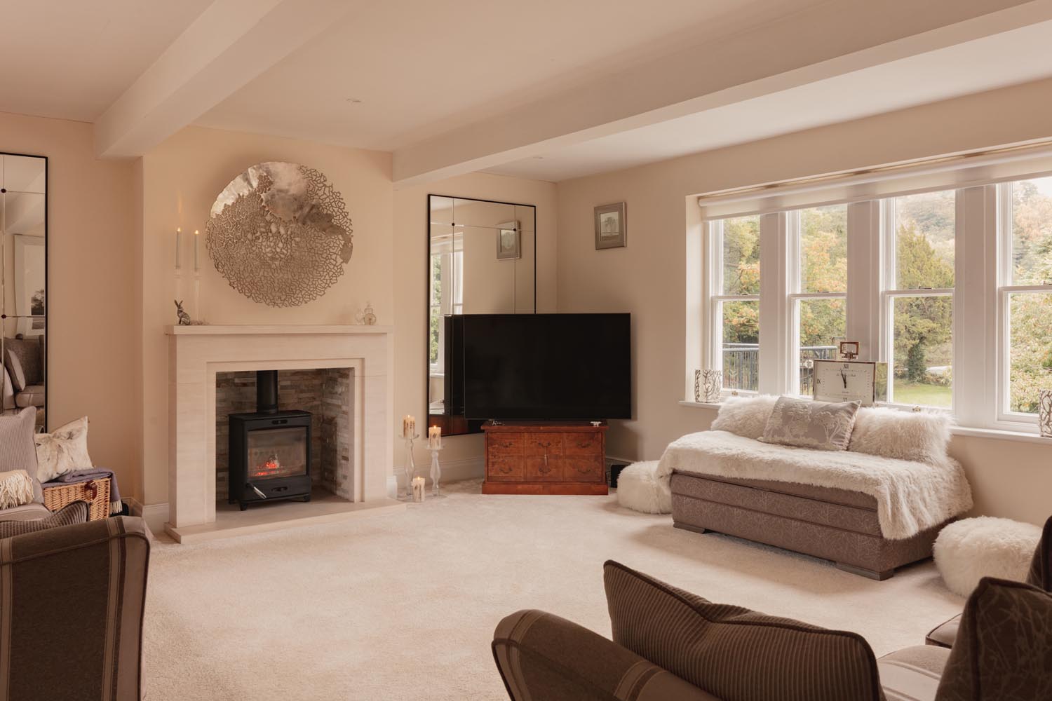 The first floor is designed for light, space and connection with the surroundings. The living room is beautifully proportioned, with tall sash windows framing long views across the gardens and valley. A limestone fireplace with wood-burning stove provides a quiet focal point, while the room’s scale lends itself equally to relaxed evenings or confident entertaining.