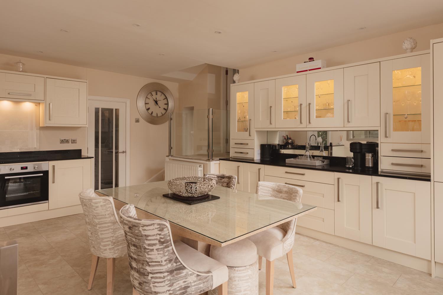 Inside, the attention to detail is immediately evident. The entrance hall establishes a calm, elegant tone, with soft light, pale tiling and warm neutral hues drawing the eye through to the main living areas. The bespoke staircase, with its sculptural handrail and painted balustrade, sets a note of craftsmanship that continues throughout the house.