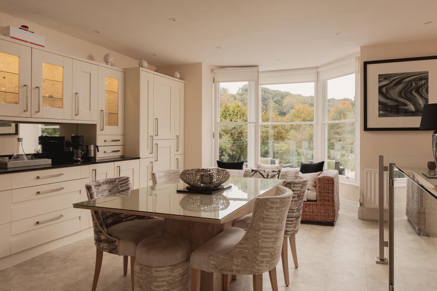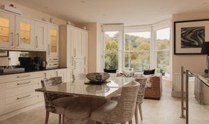 Adjoining, the dining kitchen is arranged for sociable living, with classic cabinetry, stone worktops and integrated appliances set around a generous dining area. Doors open to a balcony terrace with glass balustrade so that the river and gardens can be enjoyed throughout the seasons.