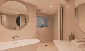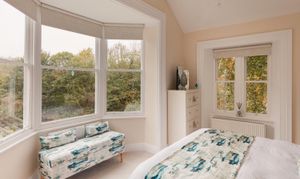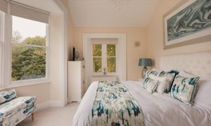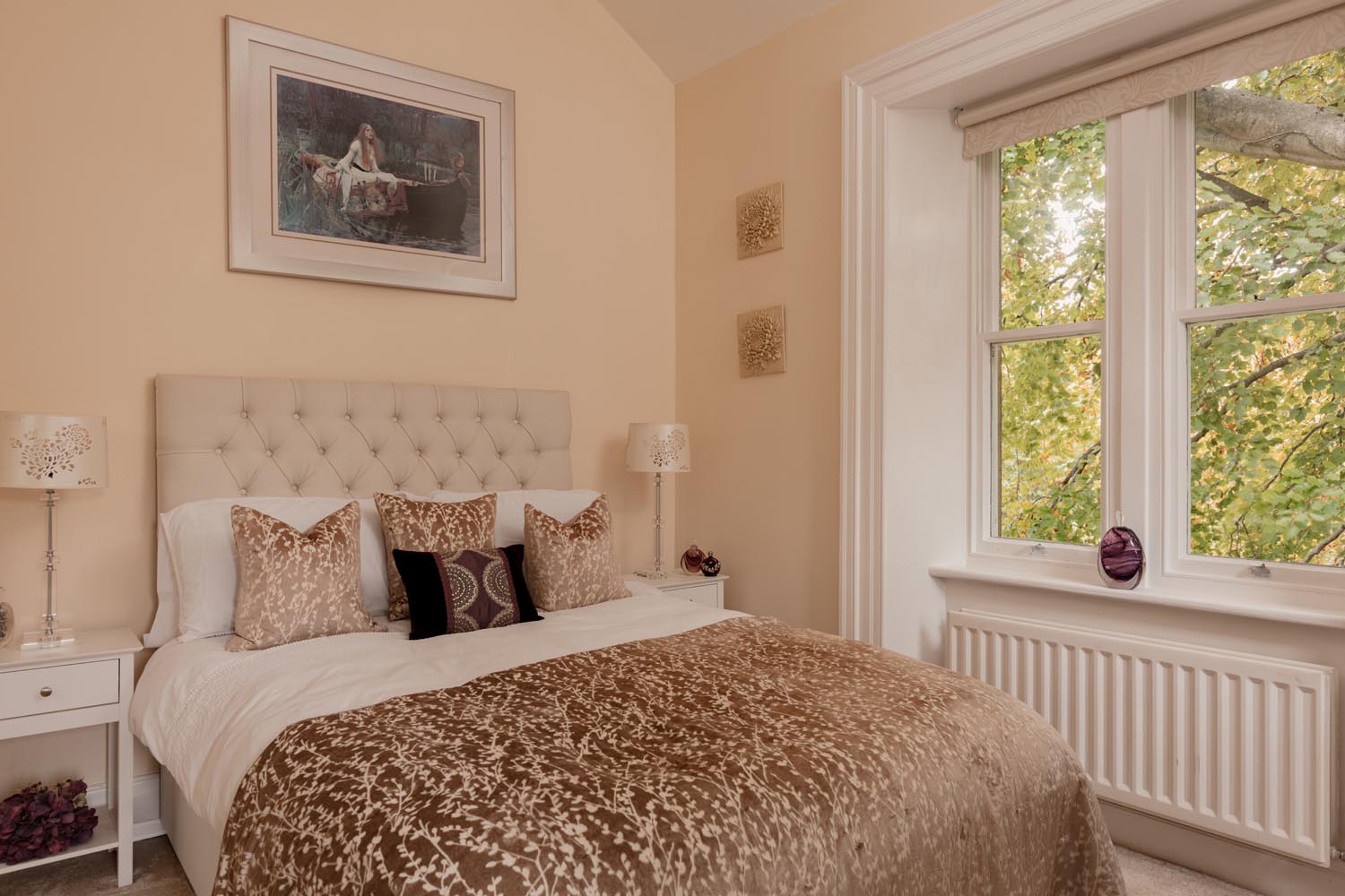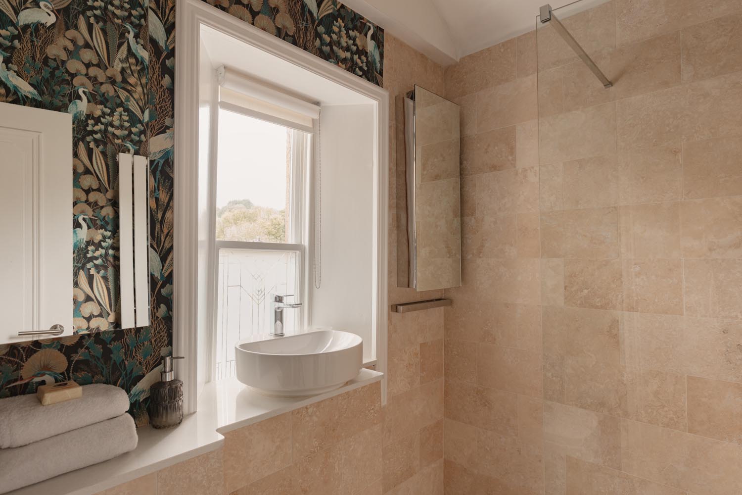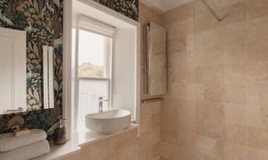On the second floor, the principal bedroom is calm and generous, with double doors opening to the garden and a soft, natural palette that complements the setting. Two further double bedrooms each have their own character, drawing in light through deep-set windows with views to the trees and river. The main shower room is luxurious and understated, finished in travertine with granite detailing and a walk-in shower that adds a contemporary touch to the period fabric of the home.