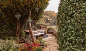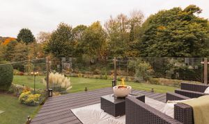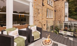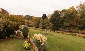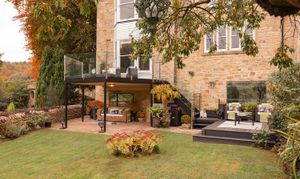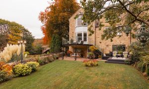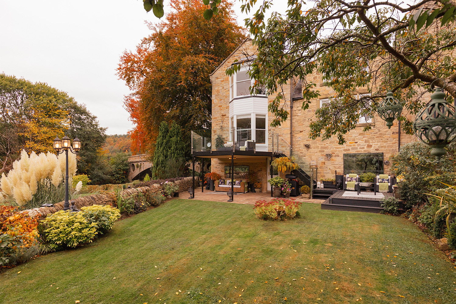 Bridge House stands within exceptional south facing riverside gardens that step gently to the water. Stone walls, established trees and designed planting give privacy and year round colour. The upper garden includes a raised entertaining deck with seating for eight, a glass staircase and a balcony seating area for four, all finished with stainless steel and glass balustrading and eco decking for low maintenance. Beneath the balcony is a sheltered sitting area, while the lower garden opens to wide lawns with long views to the river and weir and a choice of quiet seating spots in both sun and shade.