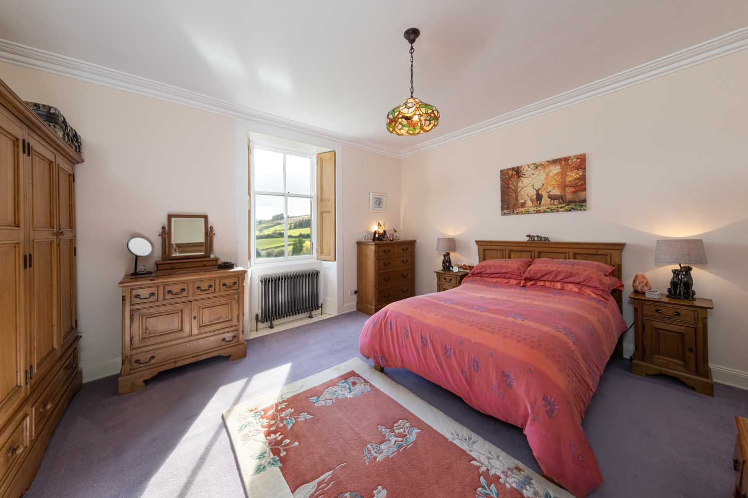 A carved sandstone staircase to the first floor leads from the elegant entrance hall to the first floor, providing access to the principal bedroom and five further bedrooms. Stunning views of the surrounding countryside can be enjoyed from each of the bedrooms. The principal bedroom benefits from an en-suite bathroom and adjoins a bedroom that could be configured as a dressing room to create a single private suite. The remaining bedrooms are served by the family bathroom.