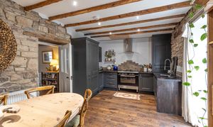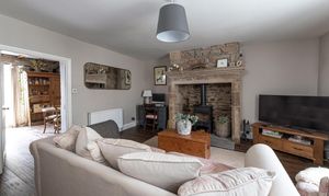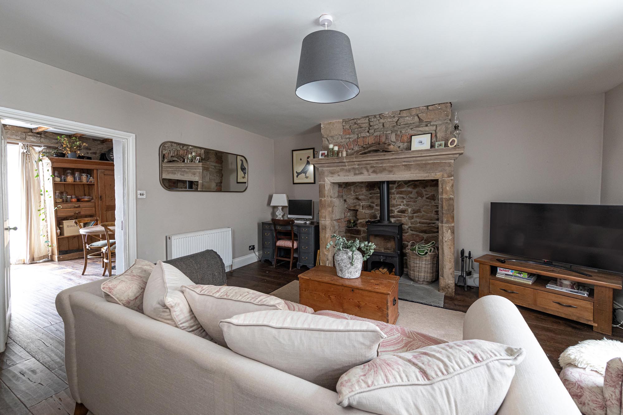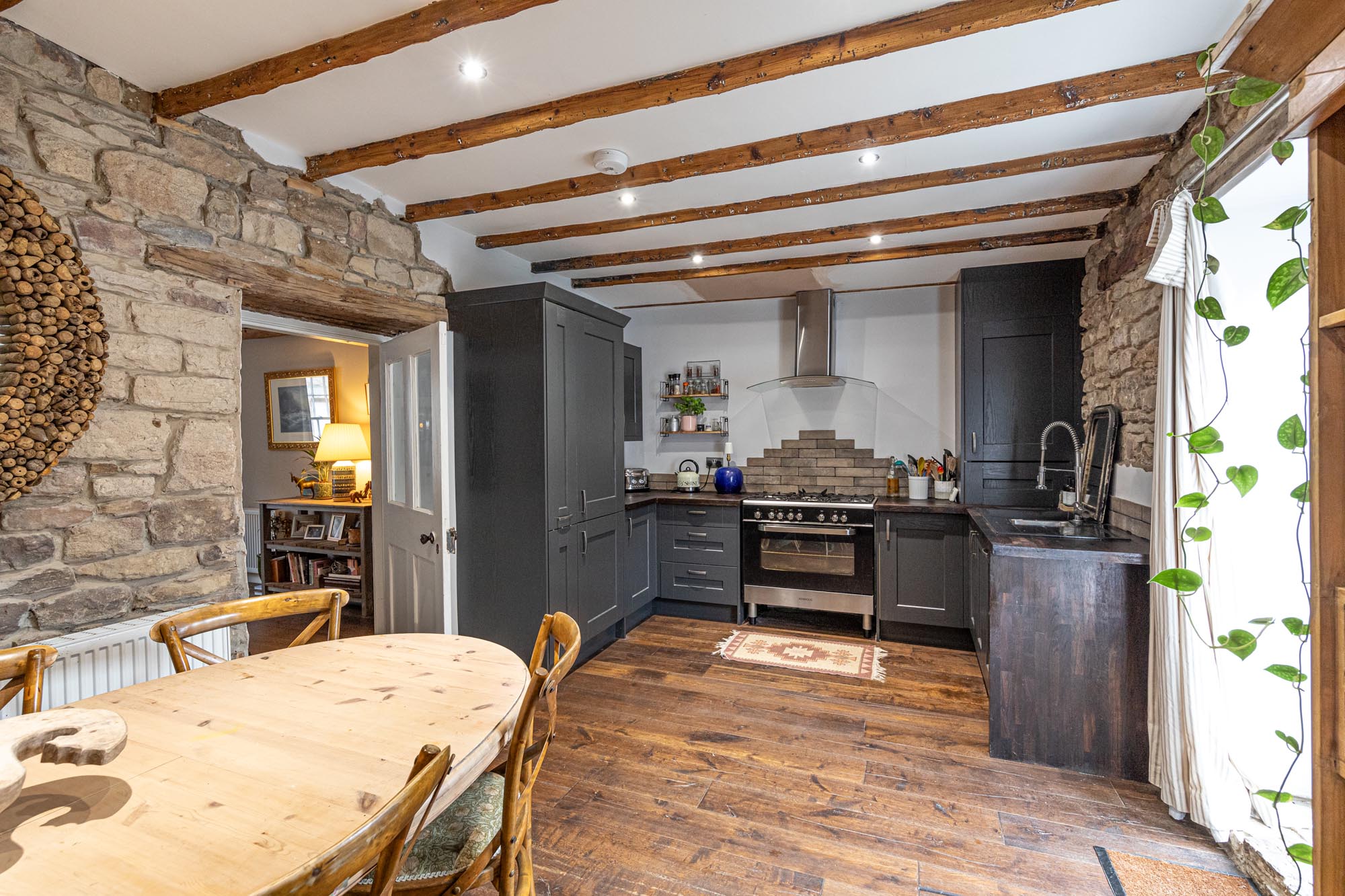 Upon entering, the entrance hallway leads into a spacious and inviting sitting room. This room features an inglenook fireplace with a wood burner, ideal for cosy nights. The sitting room opens into a bright and welcoming dining kitchen fitted with modern cabinetry, a range cooker, integrated fridge freezer, and dishwasher. Granite work surfaces complement the units and include a butler sink with a mixer tap. Hardwood flooring extends from the sitting room to the kitchen.