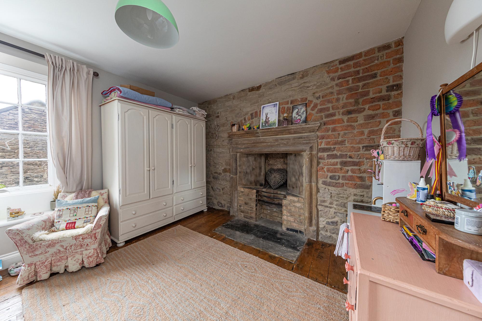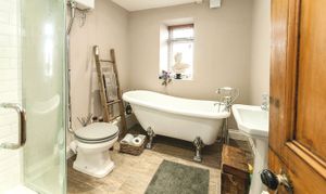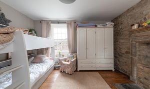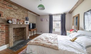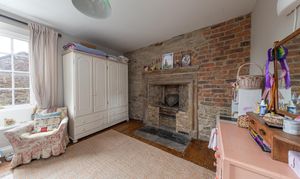 Stairs lead to the first floor, which hosts two double bedrooms, each with original fireplaces adding to their charm. A spacious bathroom on this floor is equipped with a freestanding bath, shower cubicle, wash basin, and WC, serving both bedrooms.