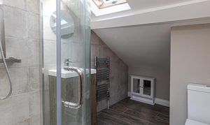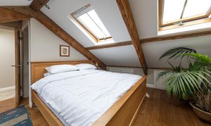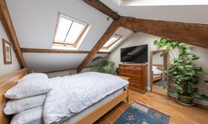 A further staircase leads to the second floor, where the spacious principal bedroom features exposed ceiling beams. This floor also includes a shower room with a shower cubicle, WC and wash basin.