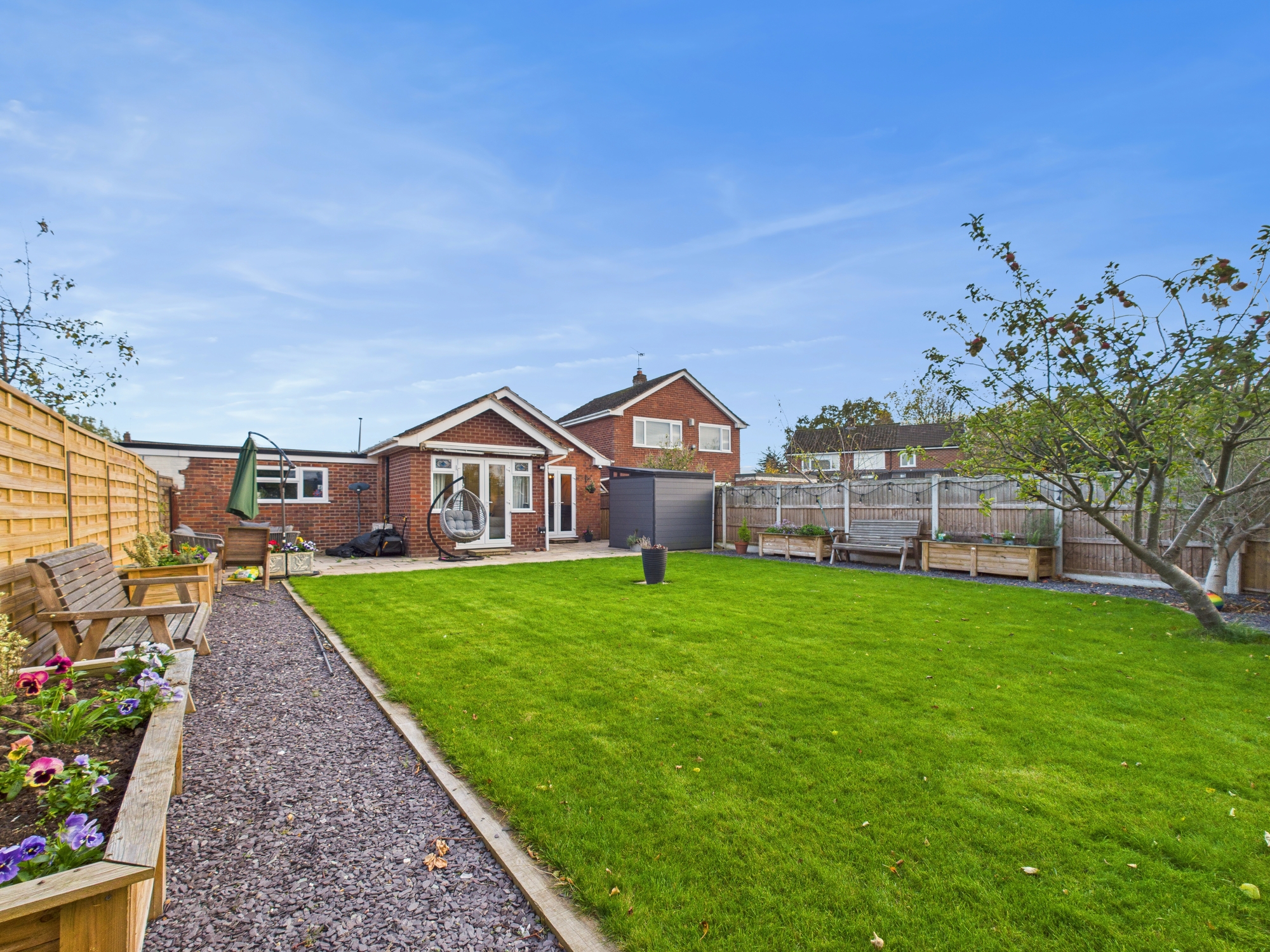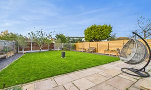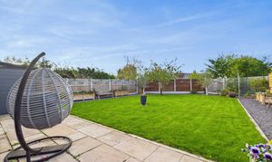 The rear garden is of a good size and enjoys a good degree of privacy, having undergone extensive enhancement works including improved lawn drainage. An expansive paved patio offers ample space for outdoor entertaining, complemented by slate-chipped seating areas, boxed planters, and timber fencing for privacy. A retractable awning, external lighting, water tap, and power points further elevate the practicality and appeal of this wonderful outdoor retreat. Gated access leads conveniently to the front of the property.
