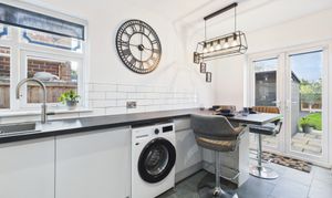 Adjoining this area is the fully renovated breakfast kitchen, showcasing sleek contemporary cabinetry, high-quality work surfaces, and a range of integrated appliances including an induction hob, dishwasher, and a Quooker hot/cold tap. A clever ‘secret’ pantry cupboard with sensor lighting offers excellent concealed storage, while a breakfast bar provides a sociable spot for casual dining. Further French doors open to the rear garden, seamlessly connecting indoor and outdoor living.