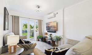 The open-plan living and dining area forms the heart of the home – a spacious and inviting setting for relaxing or entertaining, enhanced by underfloor heating and a remote-operated air conditioning system providing both warm and cool air. UPVC French doors open directly onto the rear garden.