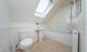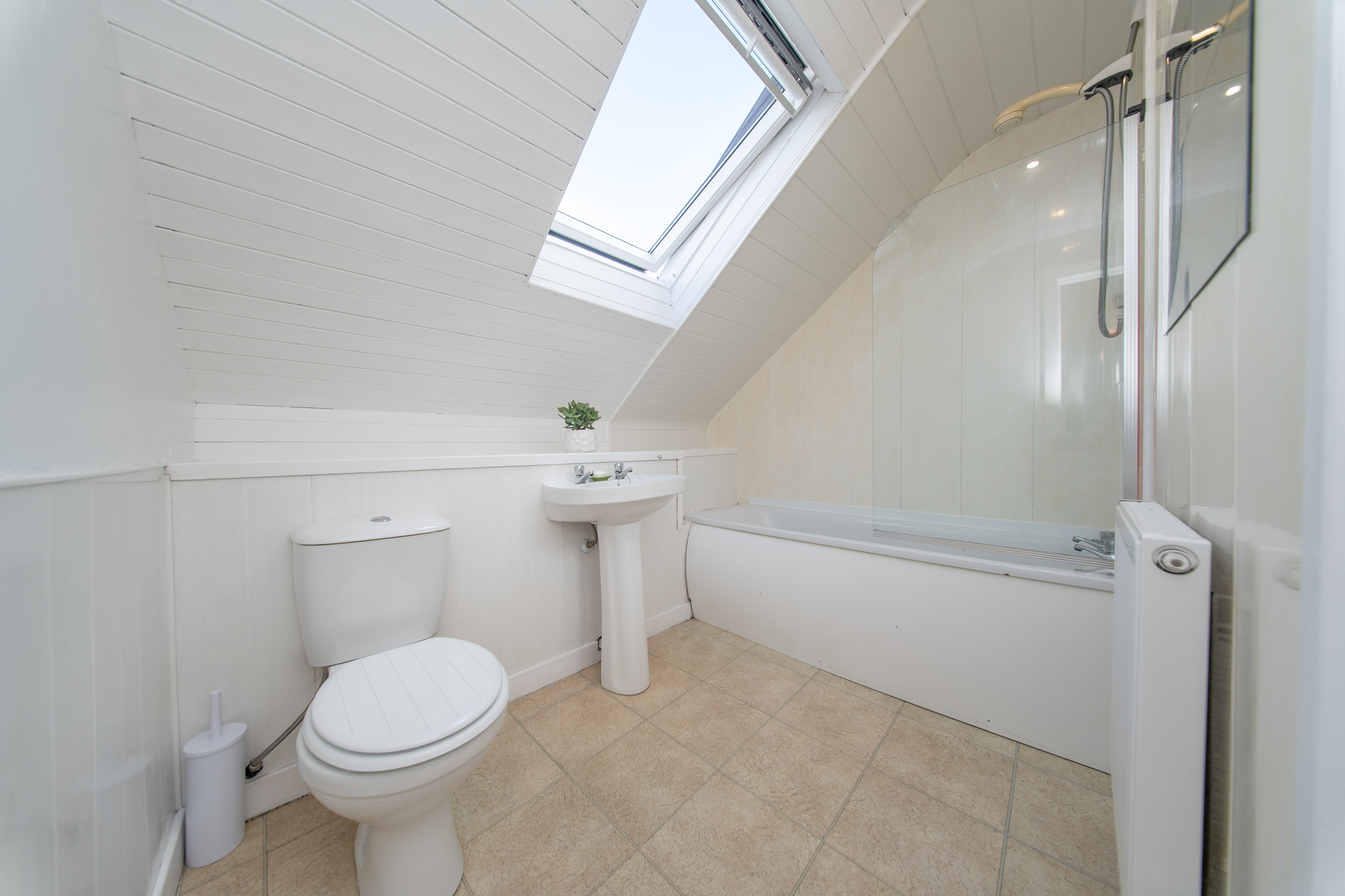 This bathroom is neutrally styled with white painted cream wet wall panelled walls, and cream tile effect vinyl flooring, creating a simple and tidy look. A rear facing velux window brings in natural light, complemented by downlights to keep the space bright throughout the day. The suite includes a bath with an electric shower overhead, a close coupled toilet, and a pedestal sink. A radiator adds warmth, completing this practical and functional space.