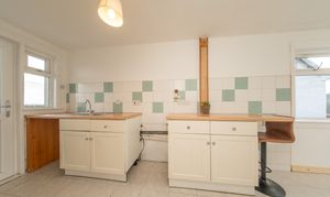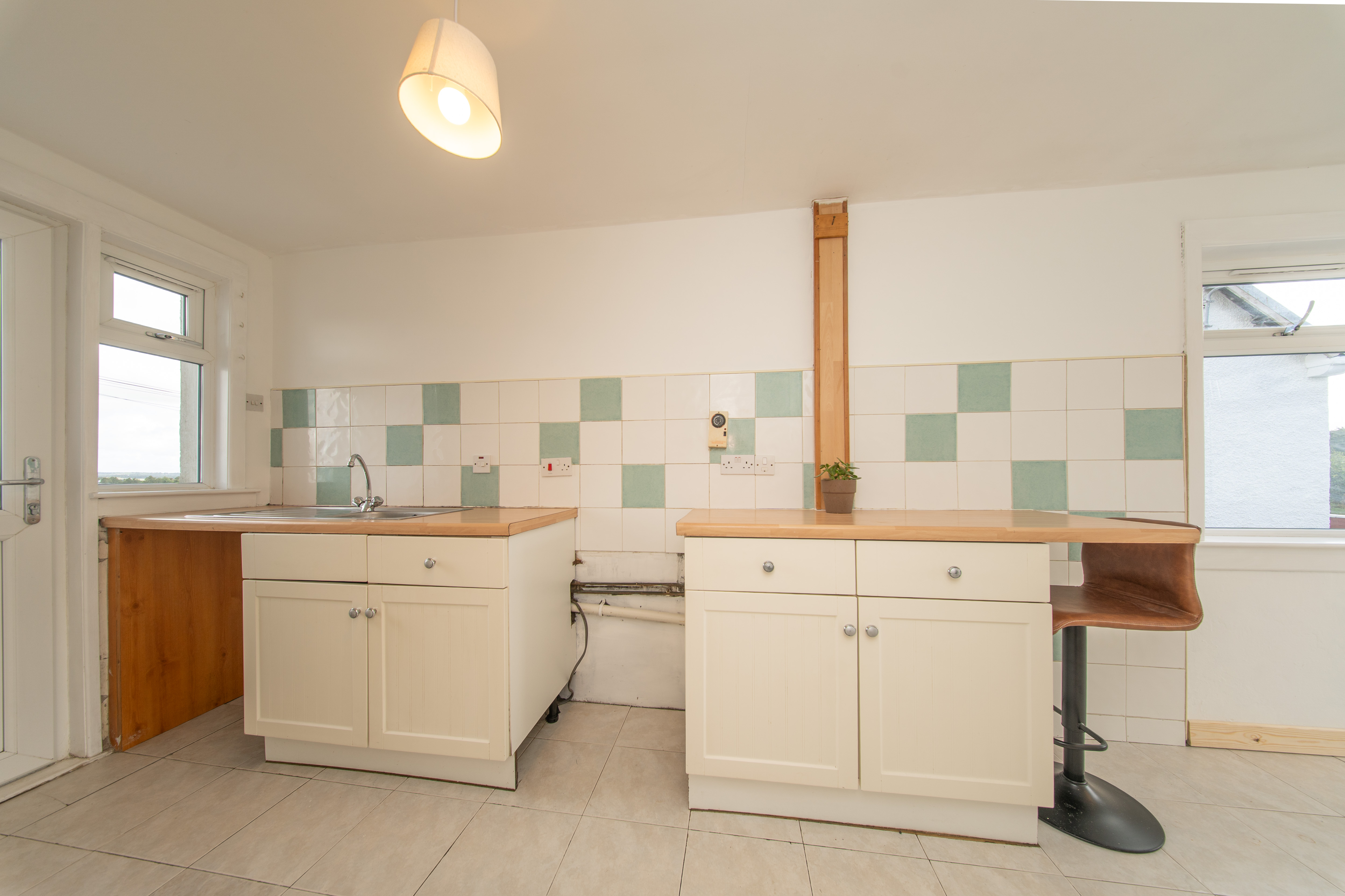 This well appointed kitchen is designed with both style and functionality in mind. It features wall and base units with cream frontages, paired with wood effect laminate work surfaces and white and green tiled splashbacks. The neutral palette is complemented by cream tiled flooring and white walls. There is dedicated space for a freestanding oven and hob, and an under counter washing machine. A well defined dining area provides the perfect spot for family meals or entertaining. Natural light floods the space through windows to the front, side, and rear, further enhanced by two ceiling lights to ensure a warm and inviting atmosphere. The sink area is fitted with a stainless steel sink, drainer, and mixer tap, while a half glazed upvc door provides access to the rear. An open press cupboard adds a decorative storage feature, alongside practical details such as power points, a radiator, a heat detector, and an attic hatch. A stylish, functional space, perfectly suited to modern living.