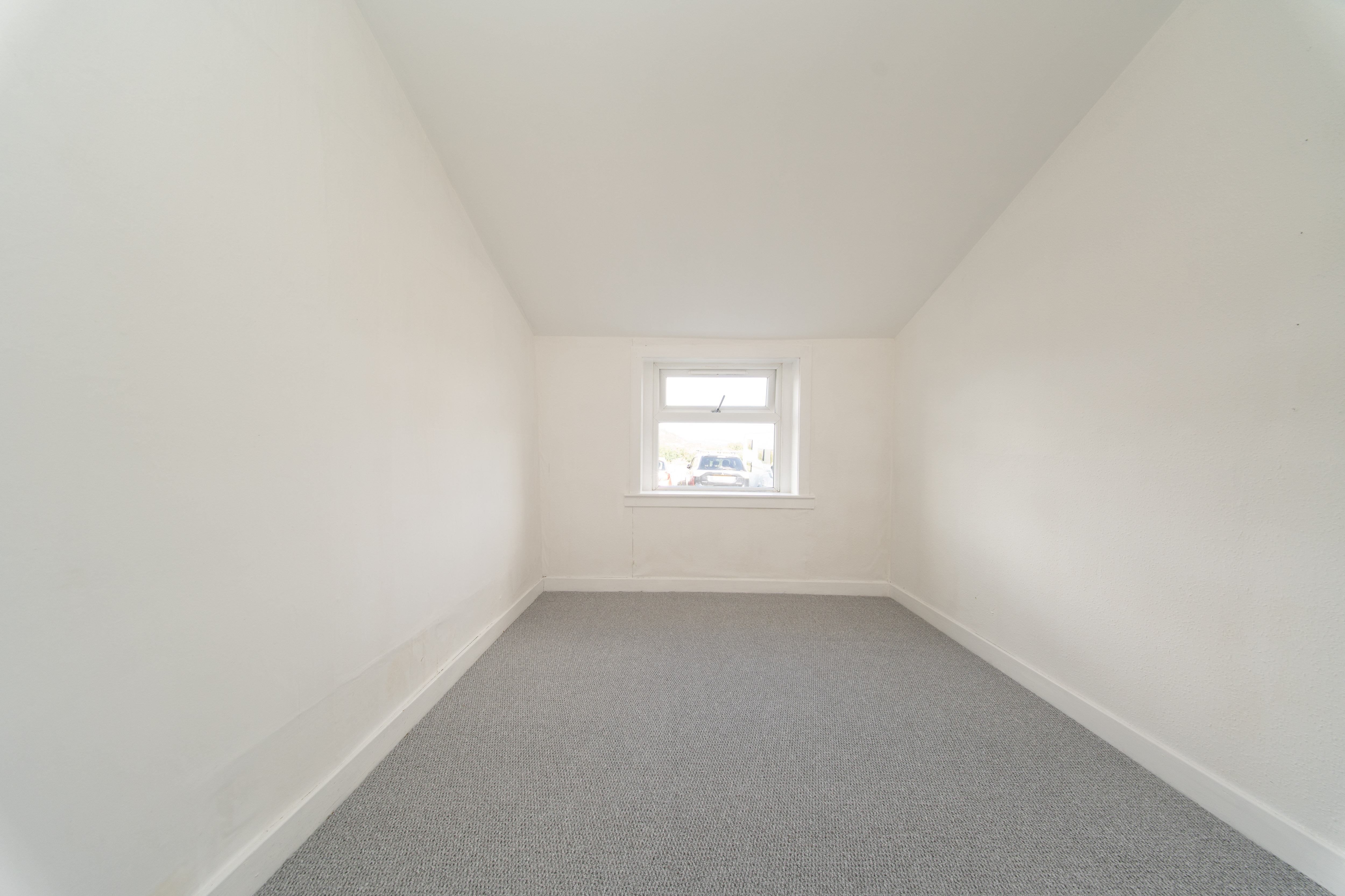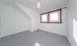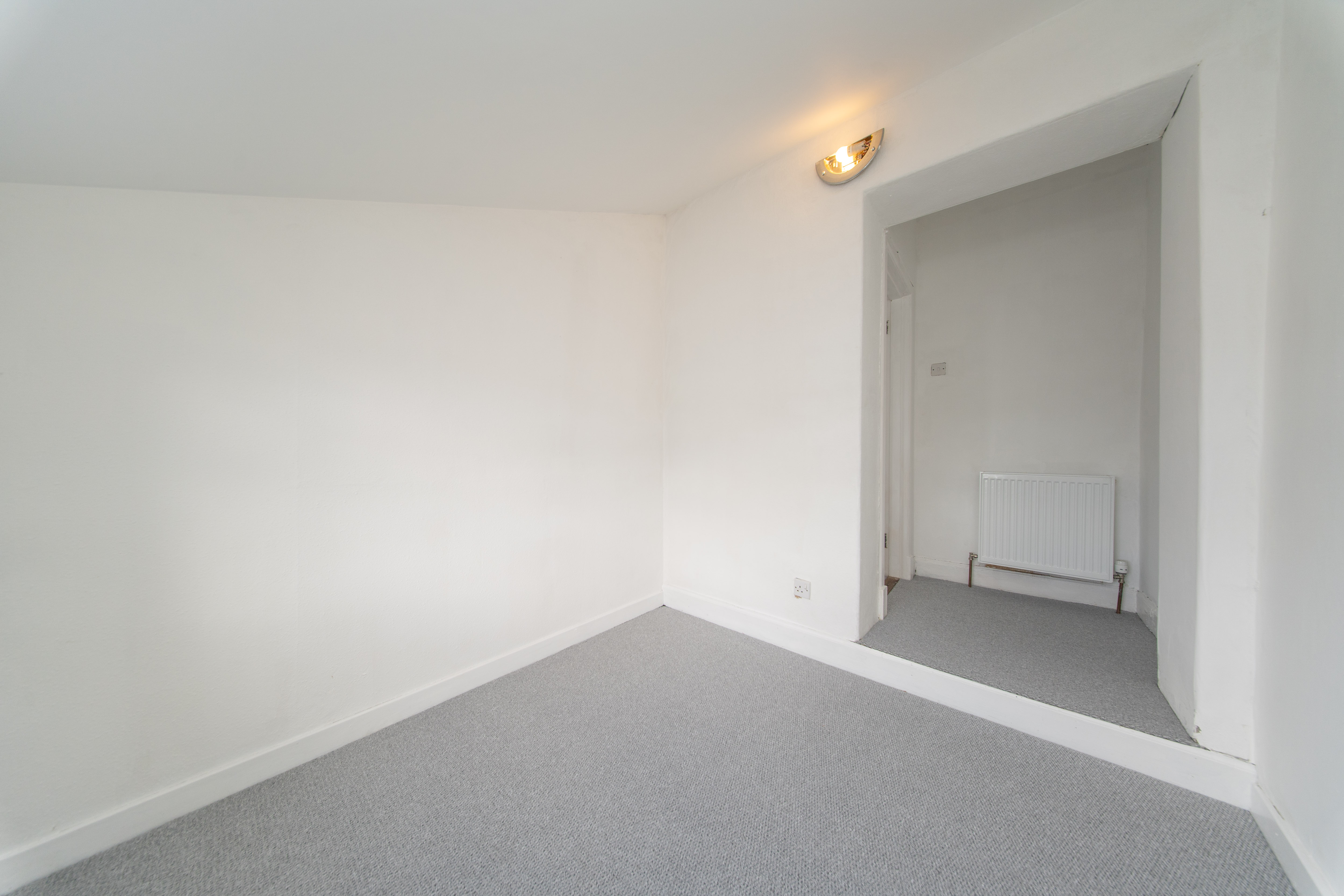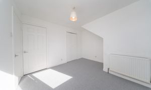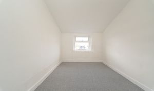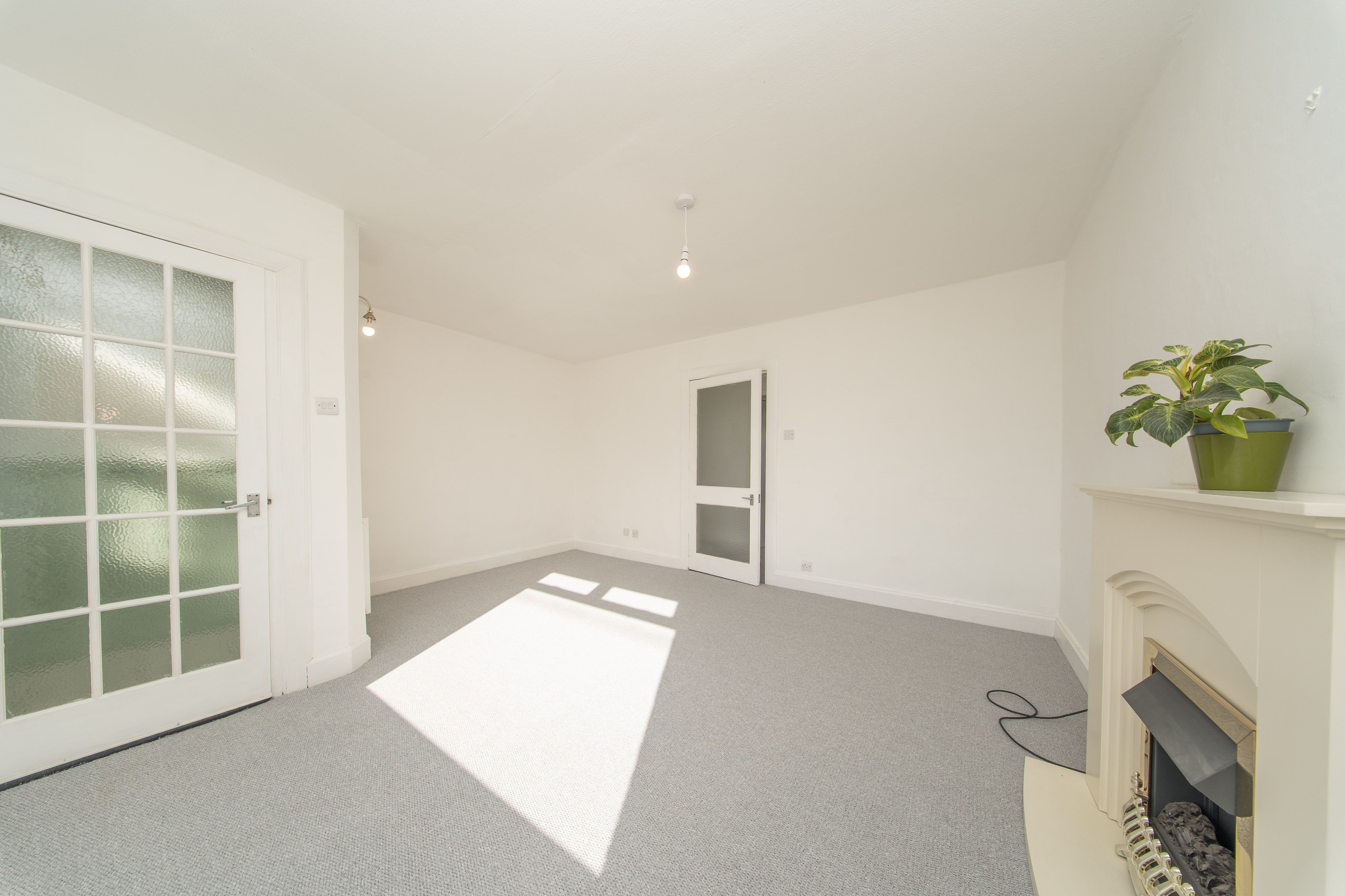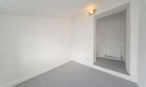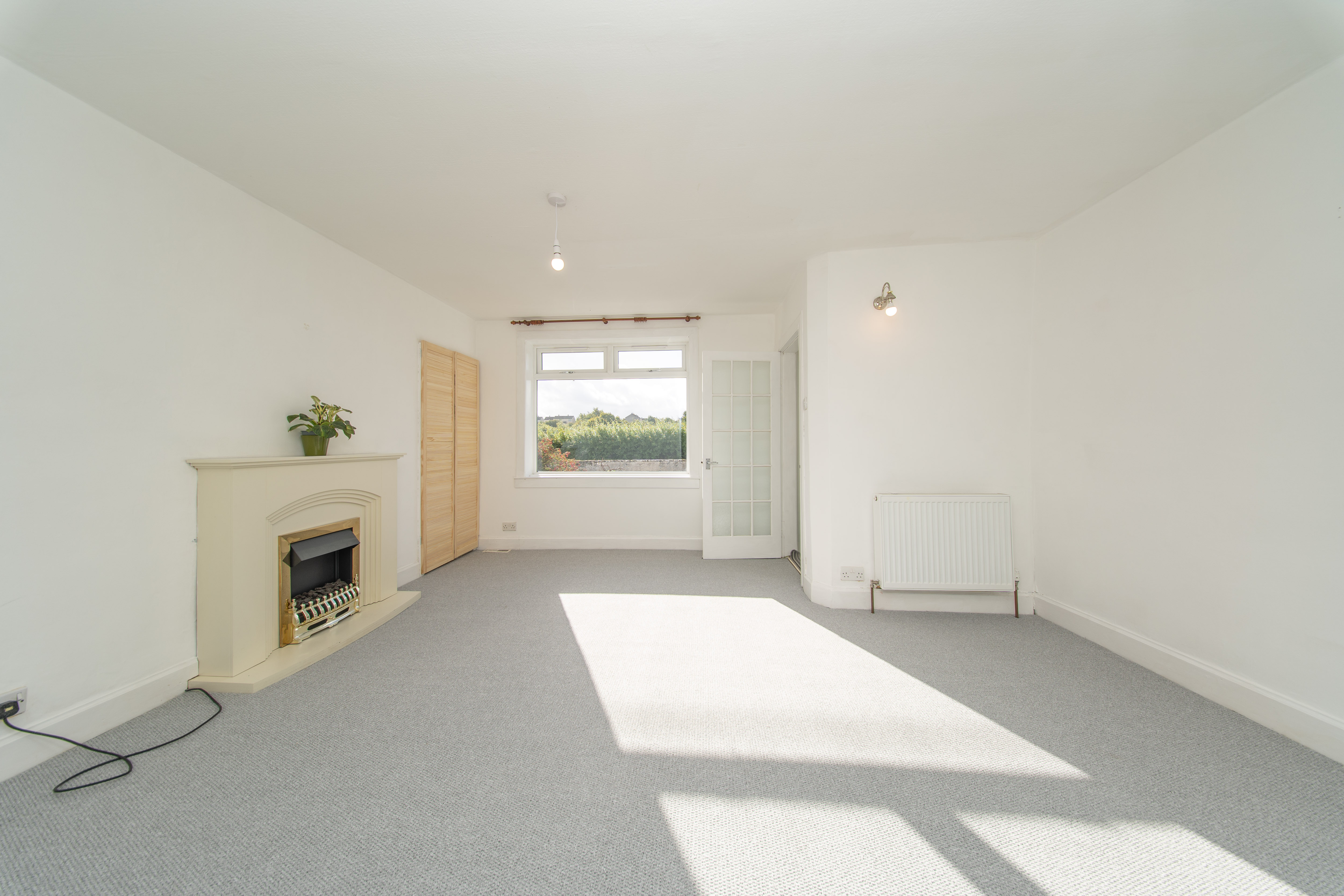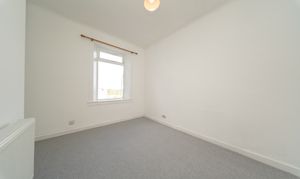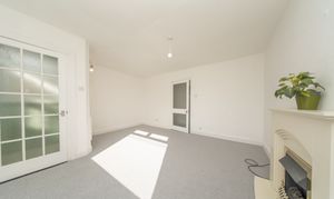 This spacious, light filled room features white walls and new carpet flooring, creating a warm and inviting atmosphere. A large front facing window lets in plenty of natural light, complemented by a ceiling light and a wall light to maintain a bright, airy feel throughout the day. A cream fireplace with electric fire adds a charming focal point. Additional features include a radiator and power points, making this a comfortable and functional living space.