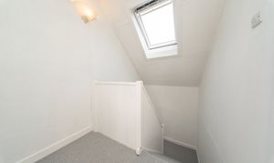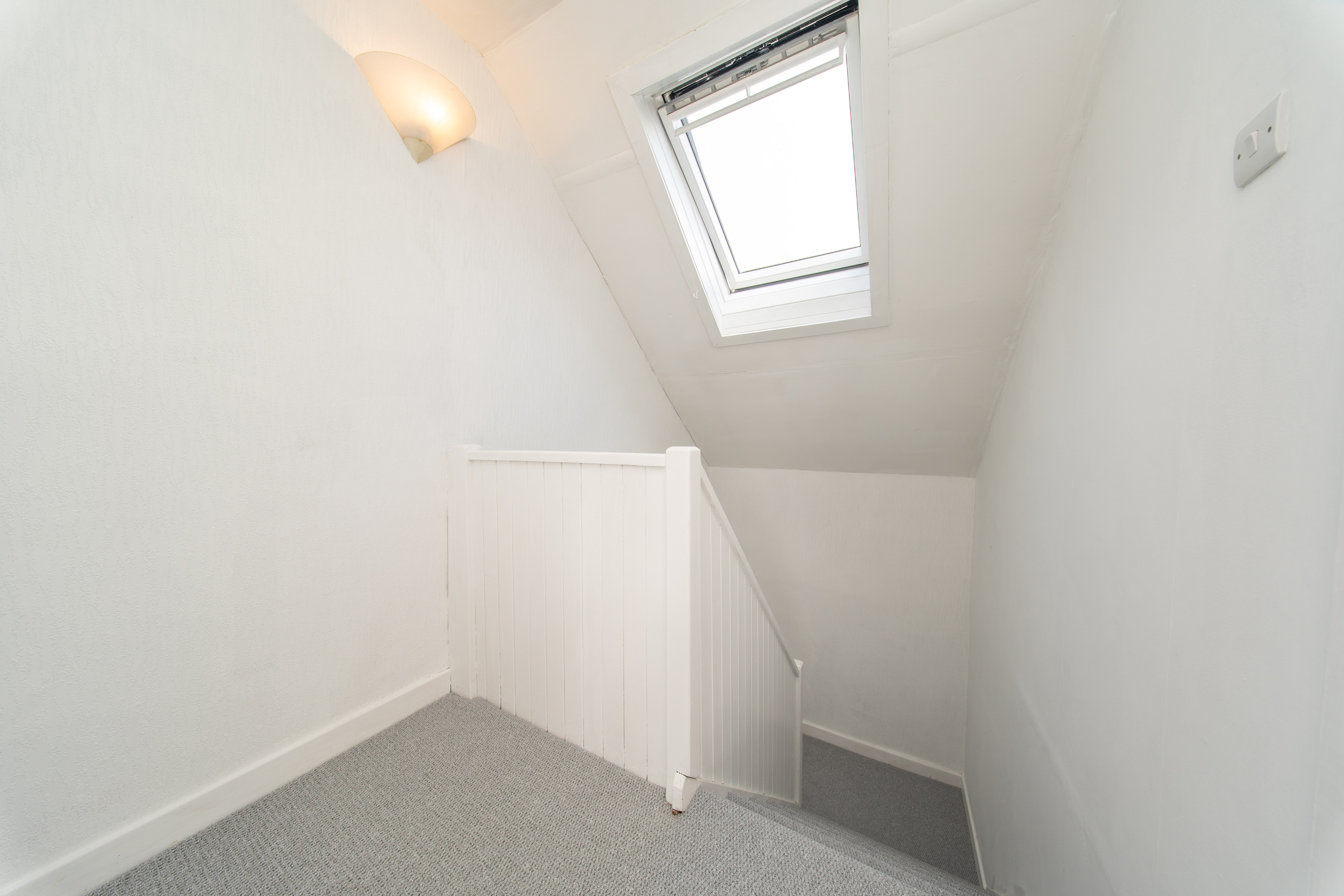 The décor flows seamlessly with carpeted stairs and landing, complemented by white papered walls. The area is bathed in natural light from the velux window to rear. Finishing touches include a wall light, a smoke detector, a power point and an attic hatch.