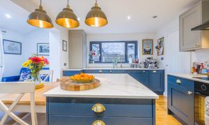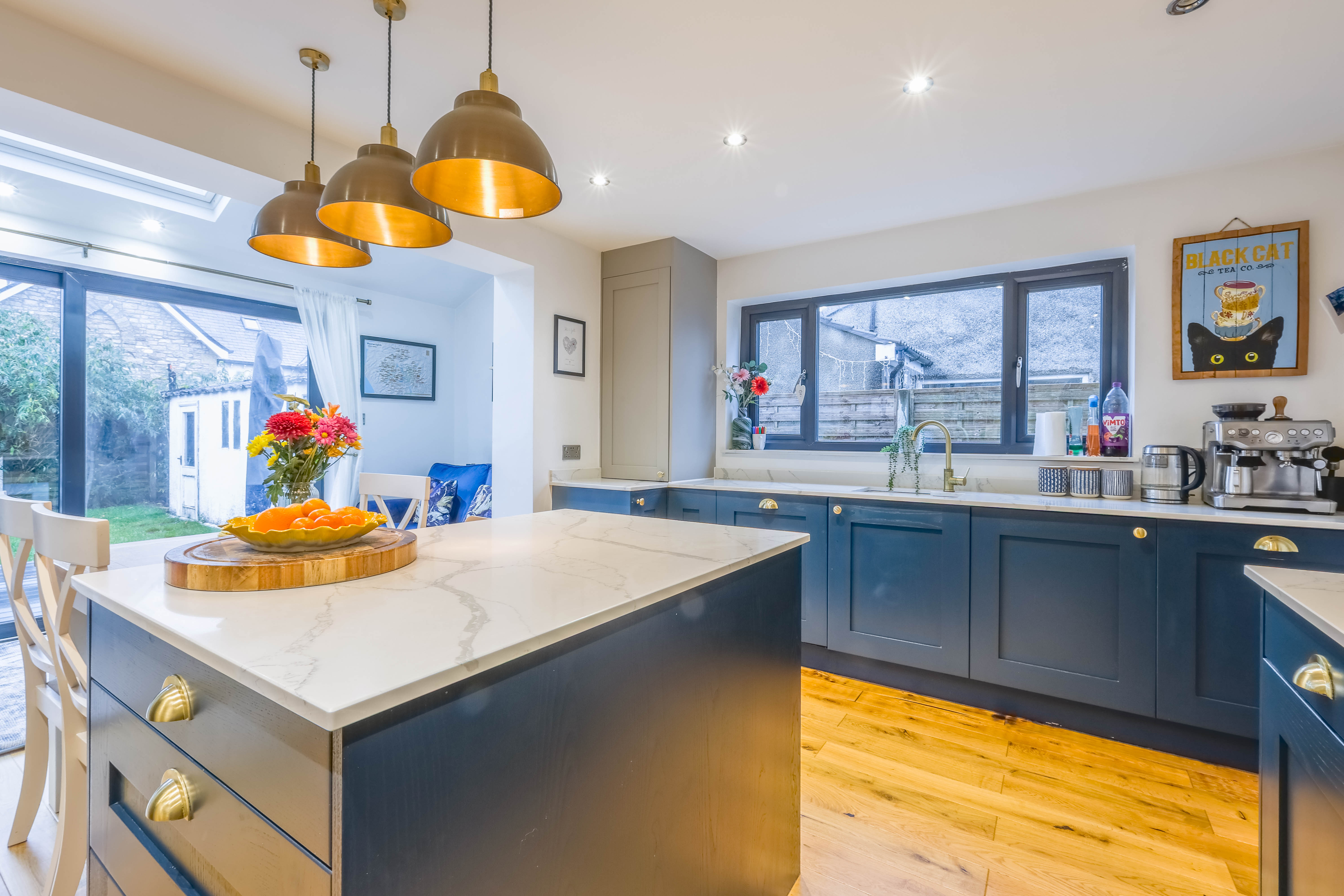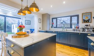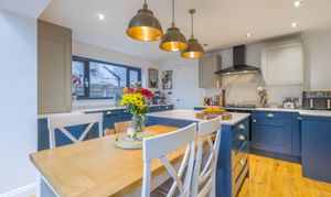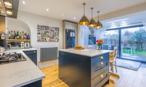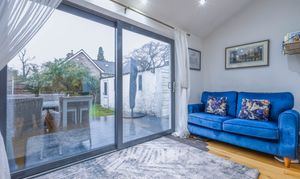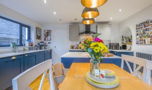 On the ground floor, the spacious open plan kitchen and dining area forms the heart of the home, featuring a sleek kitchen island, integrated appliances, elegant pendant lighting and wood flooring. Sliding glass doors lead seamlessly to the private garden and decked patio, providing an excellent space for entertaining. The inviting living room boasts a characterful wood burning stove, large bay windows flooding the room with natural light and tasteful modern décor.