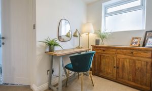 Upstairs, the property offers two generously sized bedrooms, each with built-in storage and calming neutral tones, along with a contemporary bathroom featuring a freestanding bath and walk-in shower. A convenient landing workspace area complete the first floor. The loft has been widened and is fitted with gas, electric and water, offering excellent potential for conversion into additional living space (subject to planning).