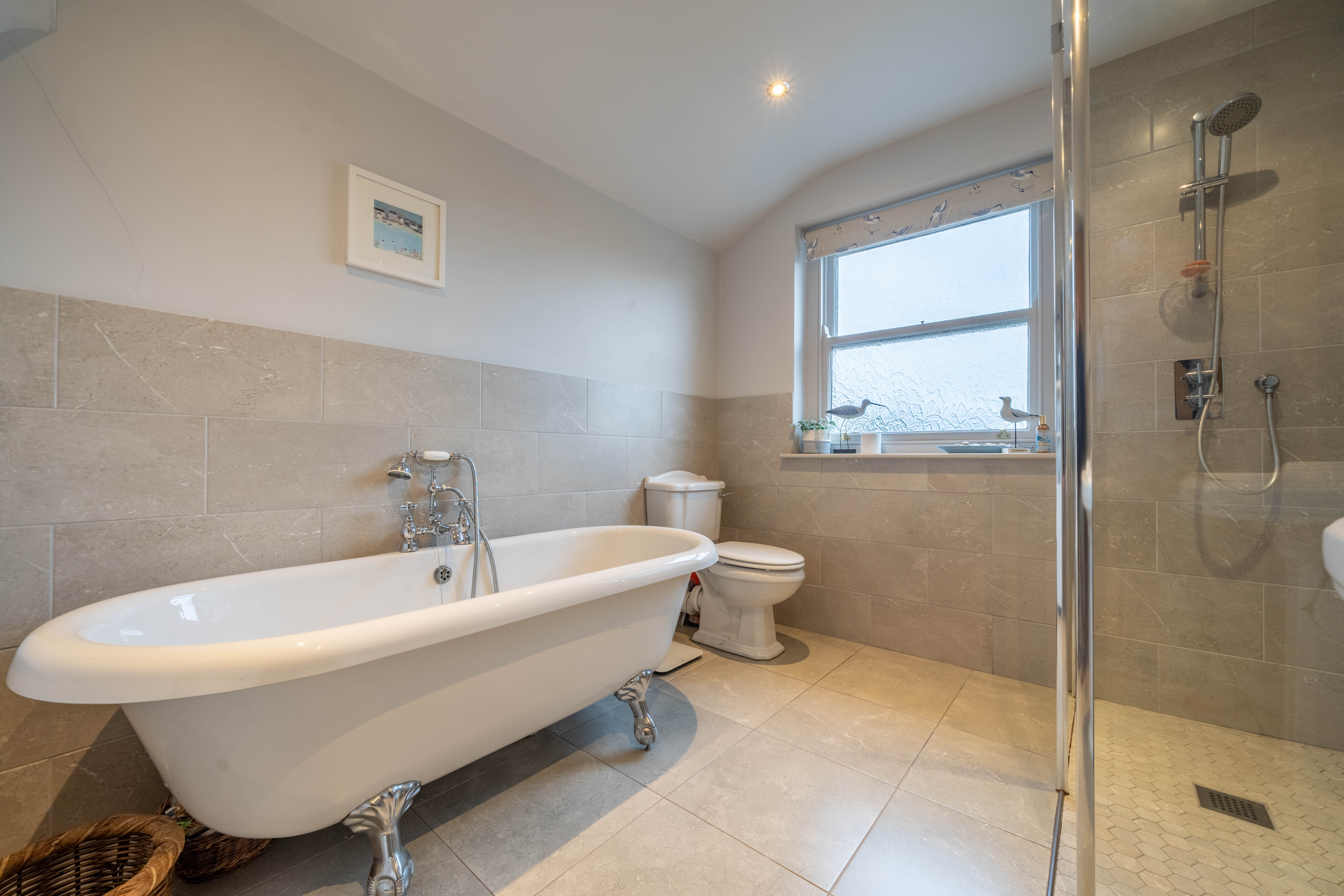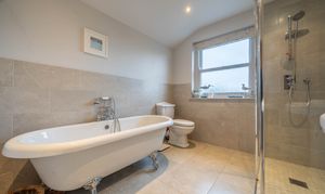- Spacious four-piece family bathroom featuring a walk-in shower and a stunning freestanding bath