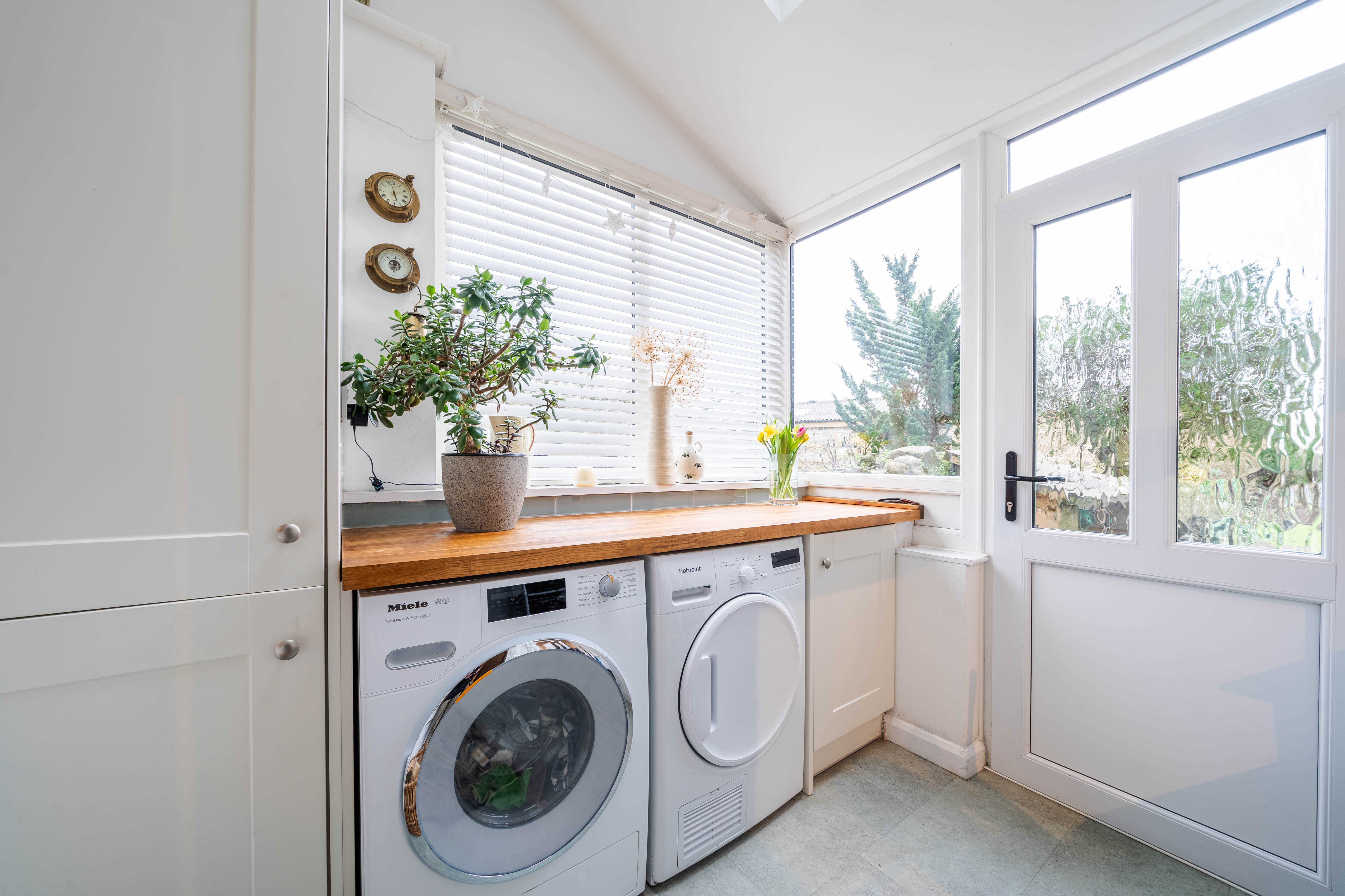 The accommodation on the ground floor is warm and inviting, with two reception rooms offering flexible living space. The welcoming lounge is a particularly attractive room, featuring a cosy log-burning stove and lovely shelving details, creating a perfect space to relax. A second reception room currently serves as a dining room, ideal for family meals and entertaining. To the rear of the property, the light and airy kitchen enjoys views over the garden and features a striking Kirkstone slate breakfast bar along with a built-in wine rack, combining character with practicality. A useful utility room provides additional space for everyday household needs, and a separate ground floor toilet adds further convenience.