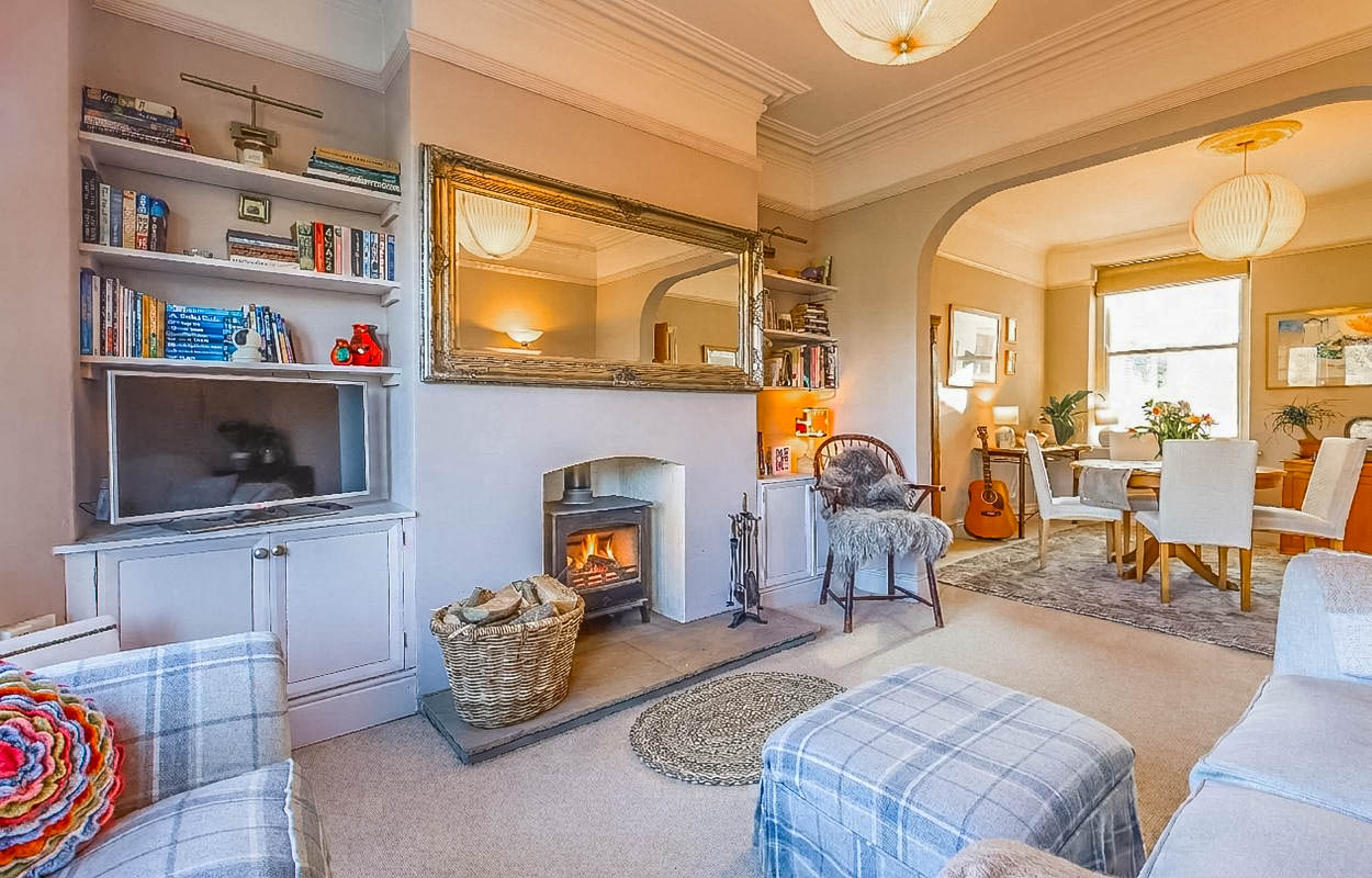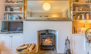 - Cosy lounge with a log-burning stove and attractive shelving details