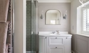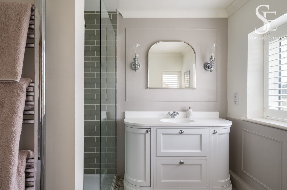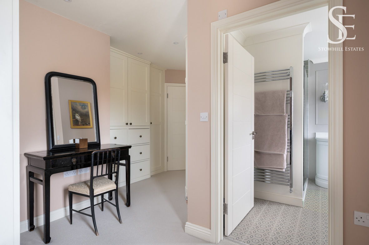 Working with the original architect, they extended the principal suite, introducing a dedicated dressing room and reconfiguring the en-suite bathroom to create something more considered and enduring. The front elevation was refined with the addition of a substantial bespoke door and oak-framed porch, gestures that bring warmth and a subtle Cotswold inflection to the façade.