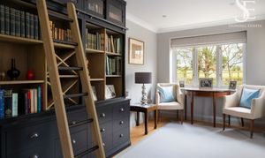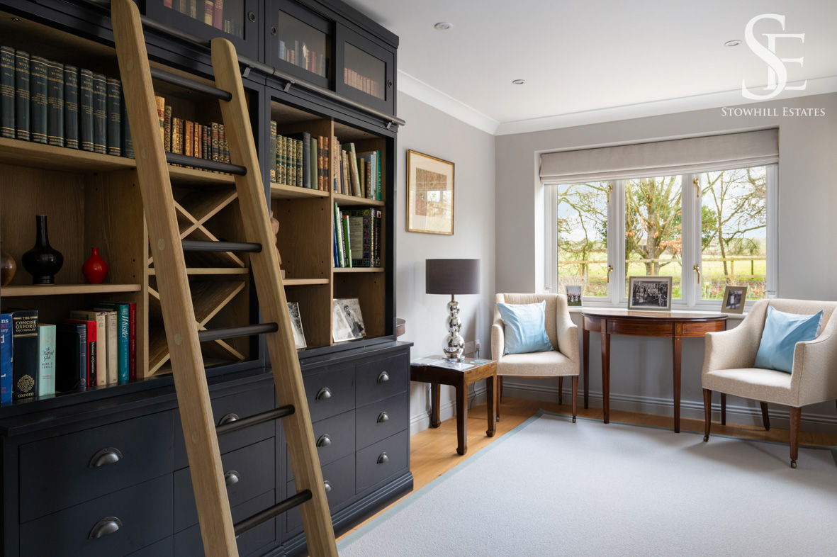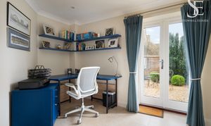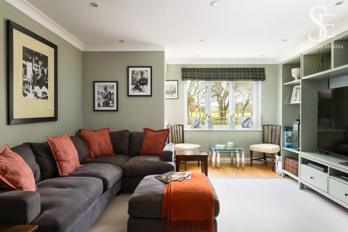 On the opposite side of the home, the sitting room offers contrast. Dual-aspect windows draw in shifting natural light throughout the day, while a wood-burning stove provides a focal point in cooler seasons. It functions variously as a formal drawing room, a television space, and a quiet corner for reading. Close by, a more intimate family room offers a softer, cocooned setting for informal evenings or time spent together. A separate study, tucked away from the main living areas, accommodates home working without interruption.