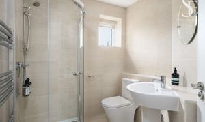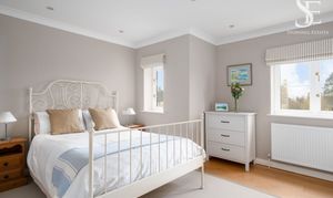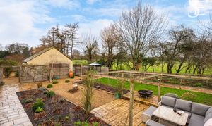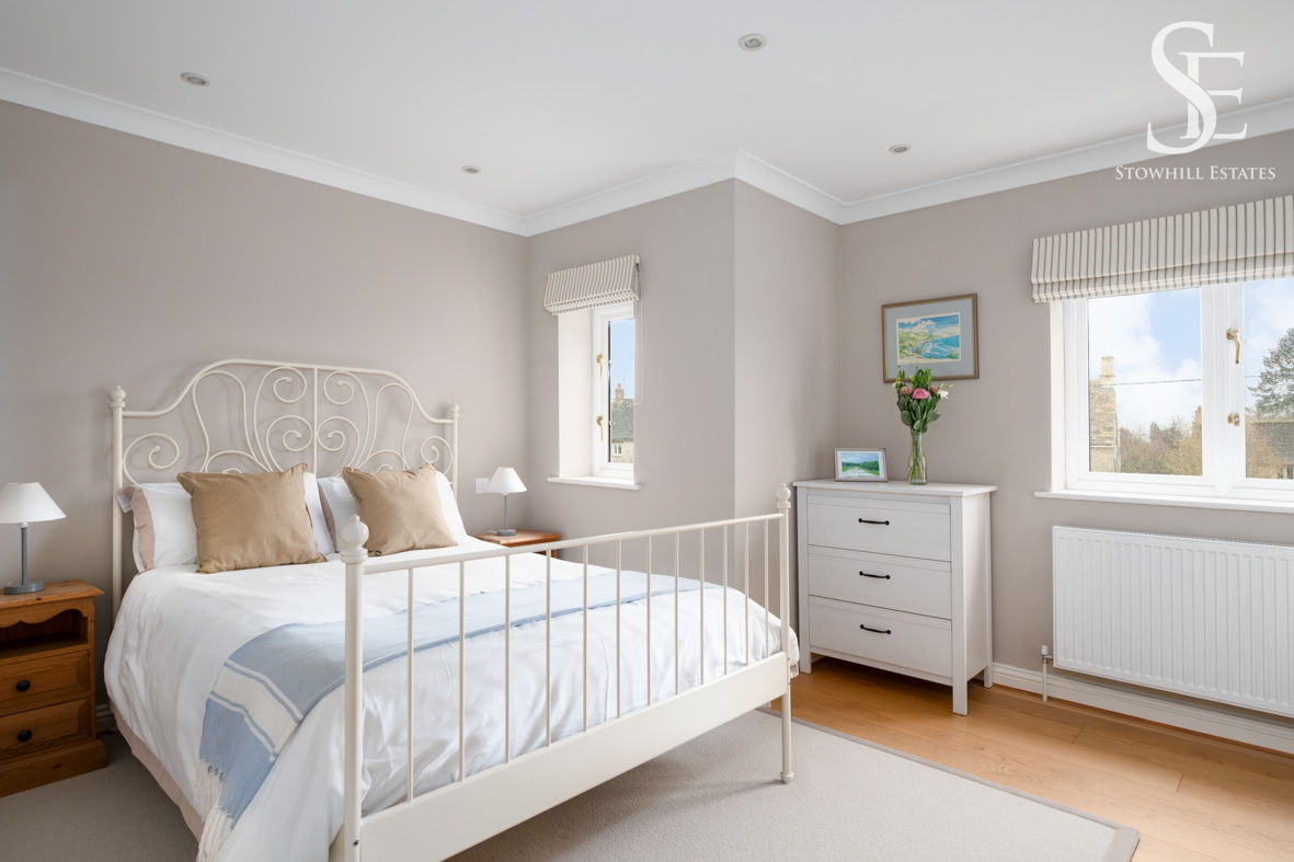 Three further bedrooms are arranged across the first floor, two with their own en-suite facilities and another served by a well-appointed family bathroom. The configuration allows for visiting family, older children seeking independence, or the steady rhythm of guests arriving across the year. From the upper windows, views stretch across neighbouring stone houses and mature trees, reinforcing the impression of being embedded within an established thriving village environment.