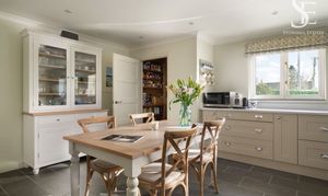 The kitchen forms the natural heart of the home. Fitted with updated cabinetry by Dream Doors and finished with quartz worktops, it is arranged around a generous island that invites conversation as much as food preparation. Twin dishwashers, a wine fridge, Quooker tap and insinkerator speak not of excess, but of thoughtful practicality. The Rangemaster induction range remains as a steady focal point. Underfoot, water-piped underfloor heating extends across most of the ground floor, providing an even warmth that supports the house’s sense of ease.