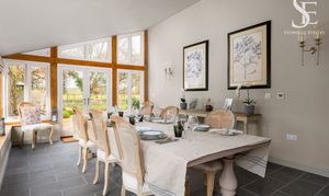 Flowing from the kitchen, the dining room is designed as an entertaining space. Glazed on multiple sides and re-roofed in slate to complement the main house, it opens directly onto the garden’s barbecue deck and pergola seating area. In warmer months, doors can be left wide, allowing meals to drift outside and long evenings to settle gradually across the terrace.