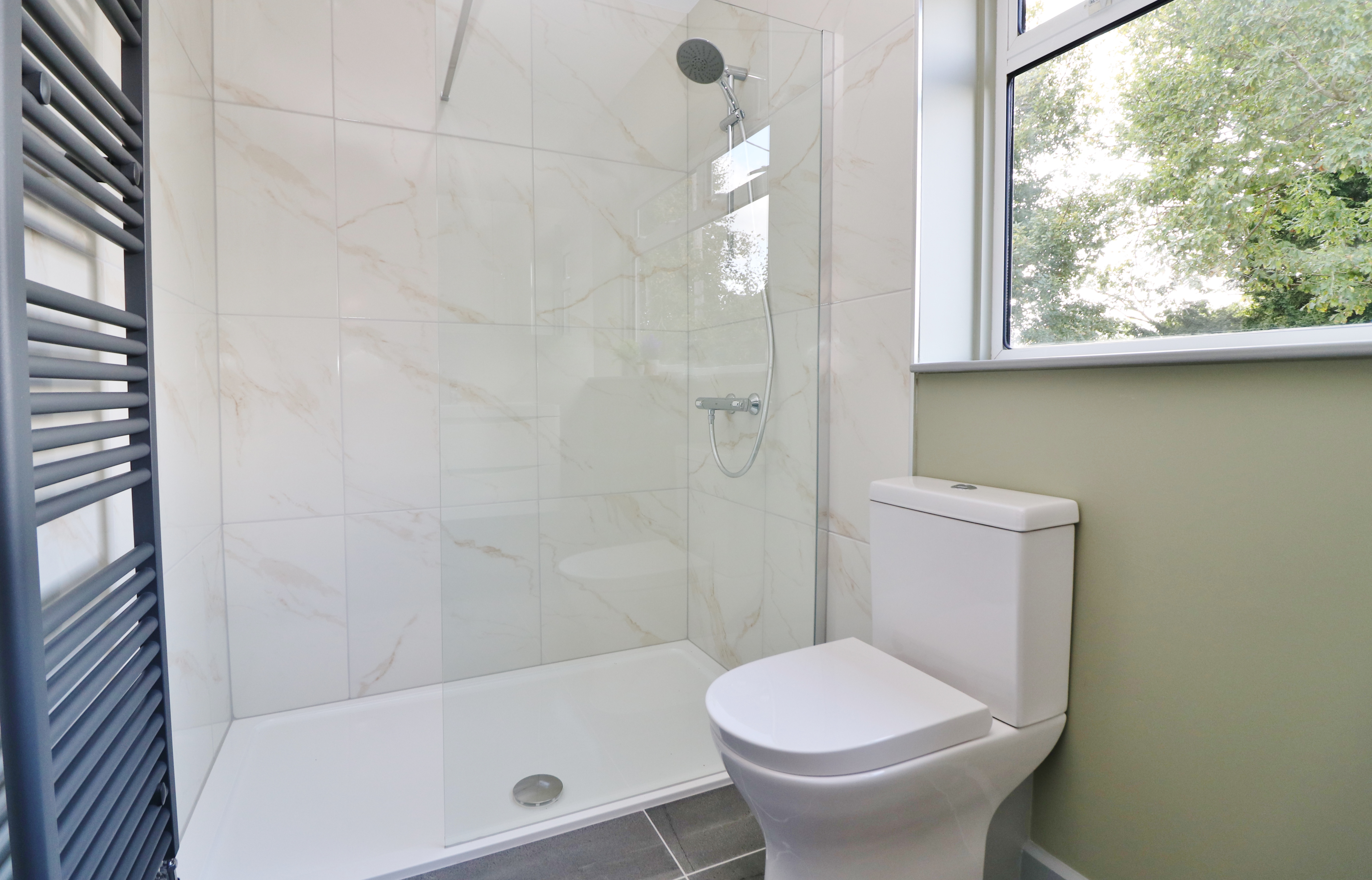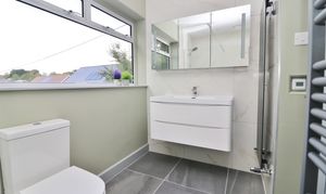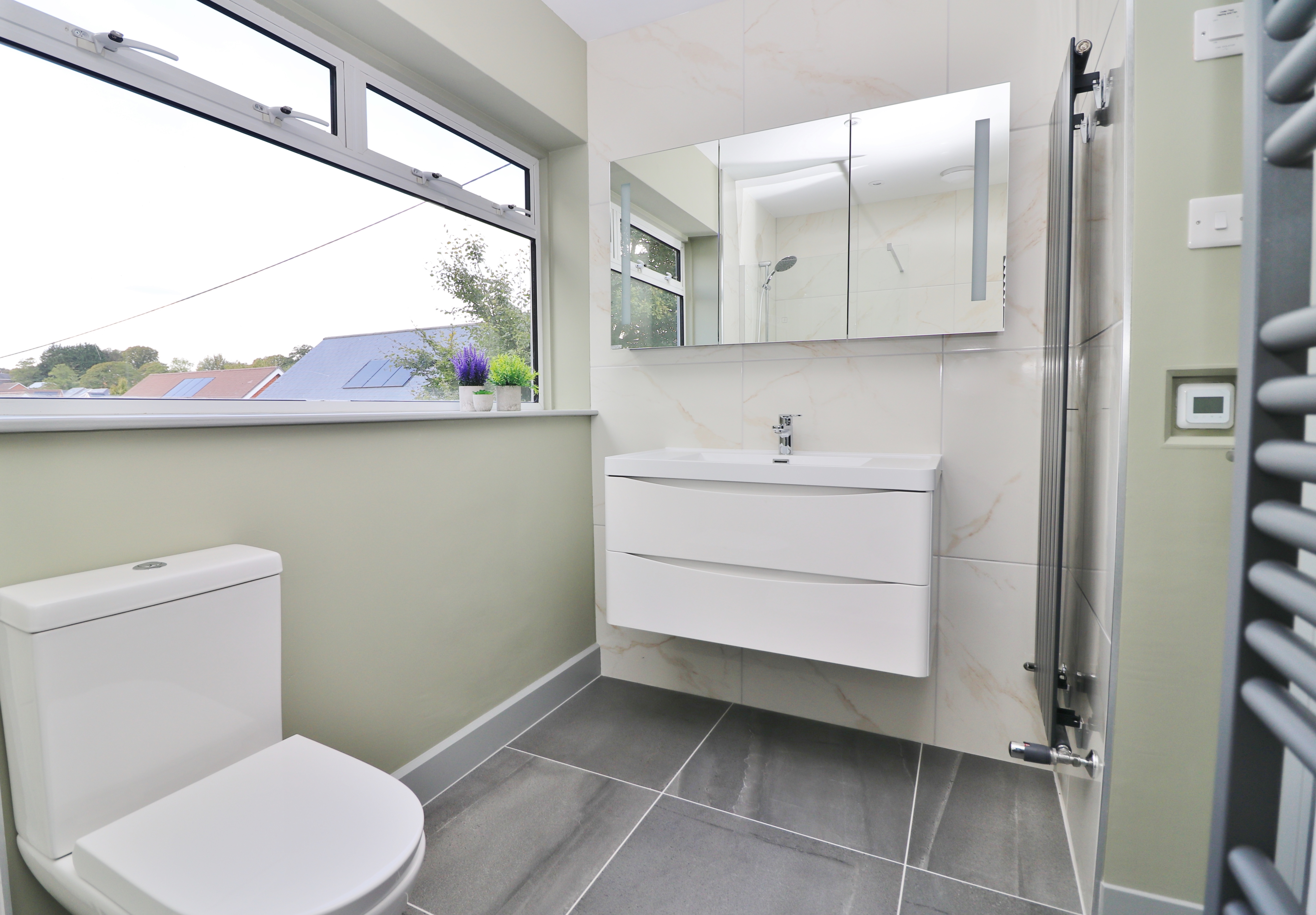 The modern family bathroom comprises a P-shaped bath with shower and screen over, vanity wash hand basin, WC, heated towel rail and a window to the side.