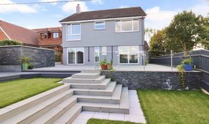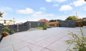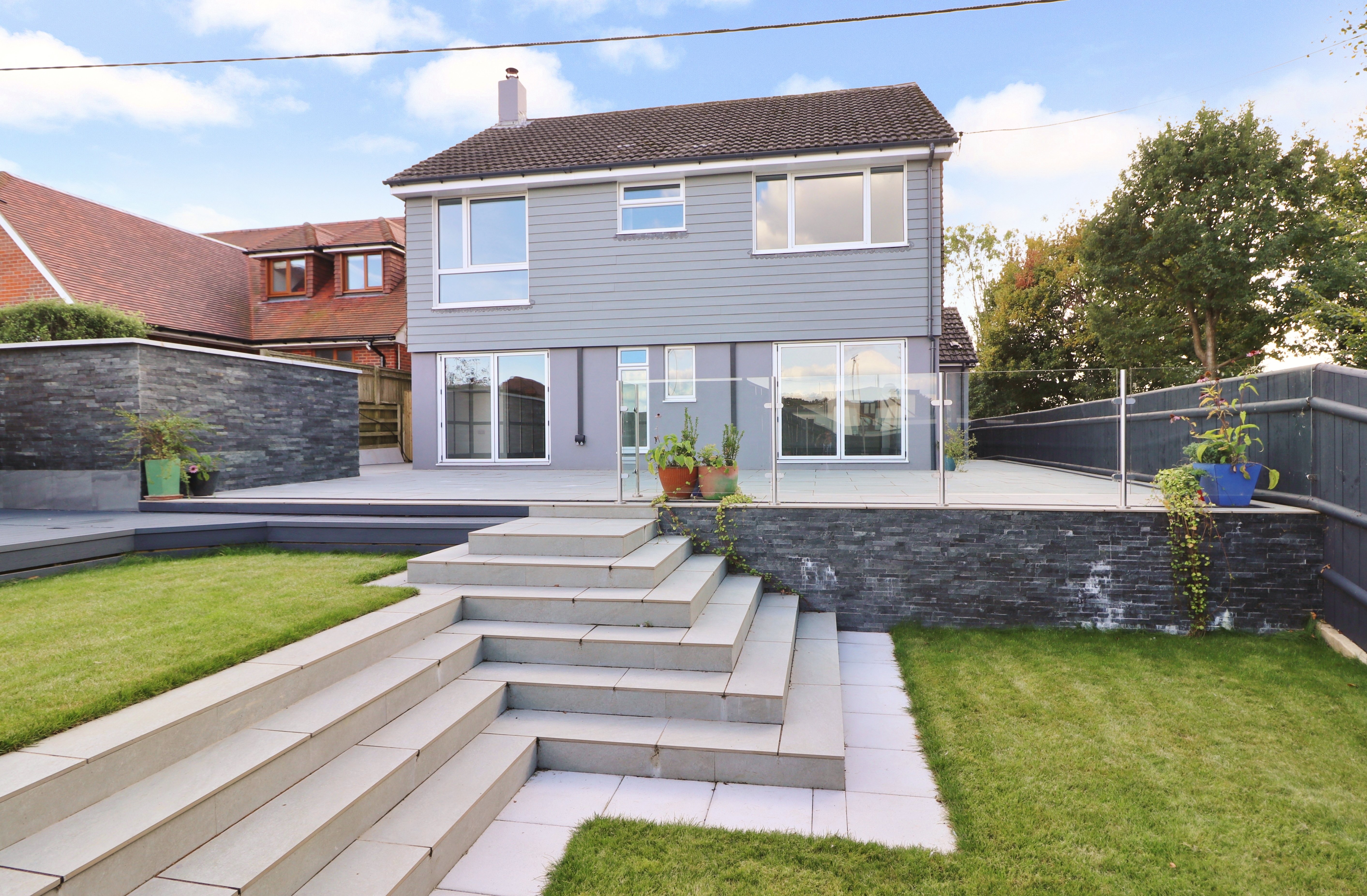 The beautiful rear garden has been thoughtfully landscaped, providing a large, paved patio area, perfect for outdoor entertaining, with a decked seating area to one side and steps leading down to two sections of lawn.