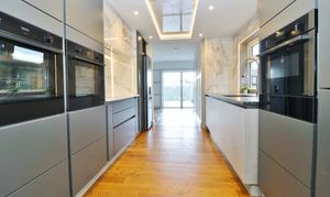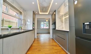 The modern kitchen has a window to the side, feature lighting and has been fitted with a range of wall and base units with three built-in ovens, a hob with extractor over, space for a washing machine and integrated appliances including a fridge/freezer and dishwasher.